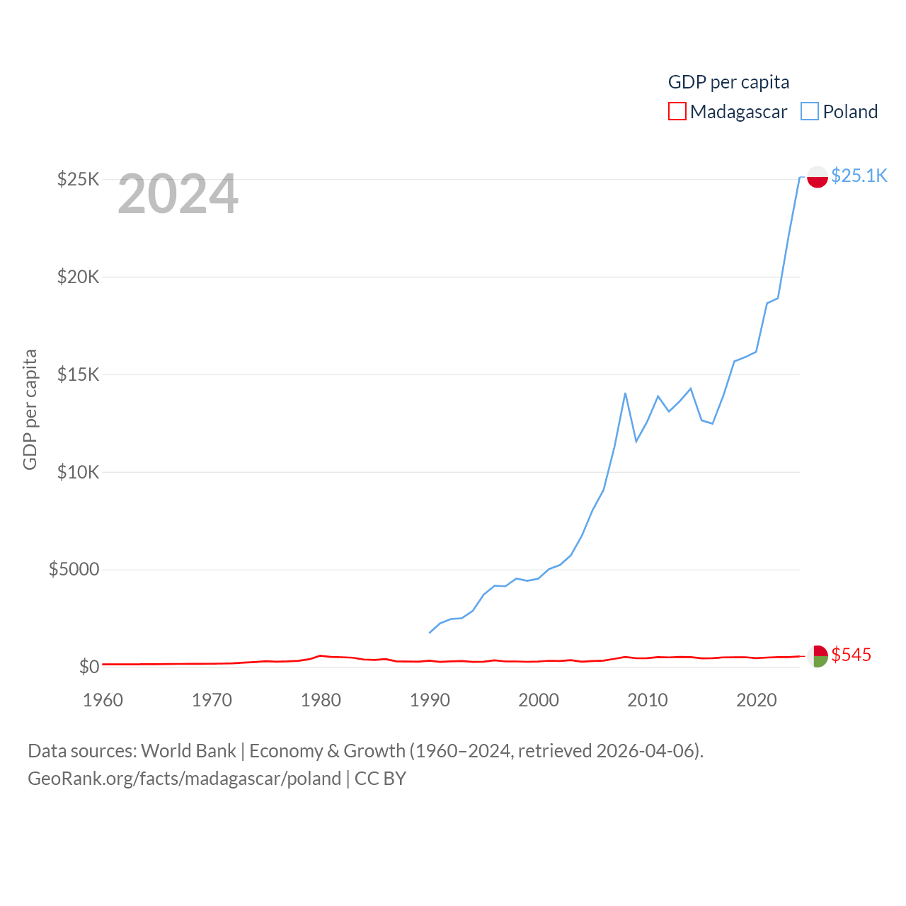 By GDP, Madagascar ranks 136/197 ($17.4B) and Poland ranks 21/197 ($918B). By GDP per capita, Madagascar ranks 193/197 ($545), while Poland ranks 48/197 ($25,104).