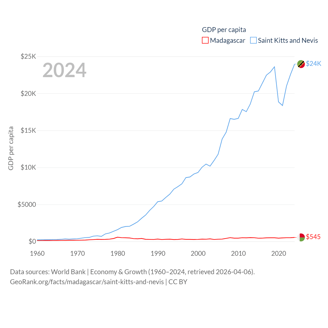 By GDP, Madagascar ranks 136/197 ($17.4B) and Saint Kitts and Nevis ranks 187/197 ($1.12B). By GDP per capita, Madagascar ranks 193/197 ($545), while Saint Kitts and Nevis ranks 51/197 ($23,961).