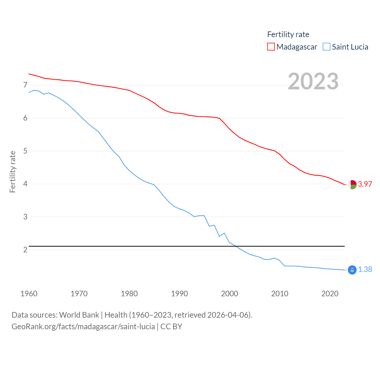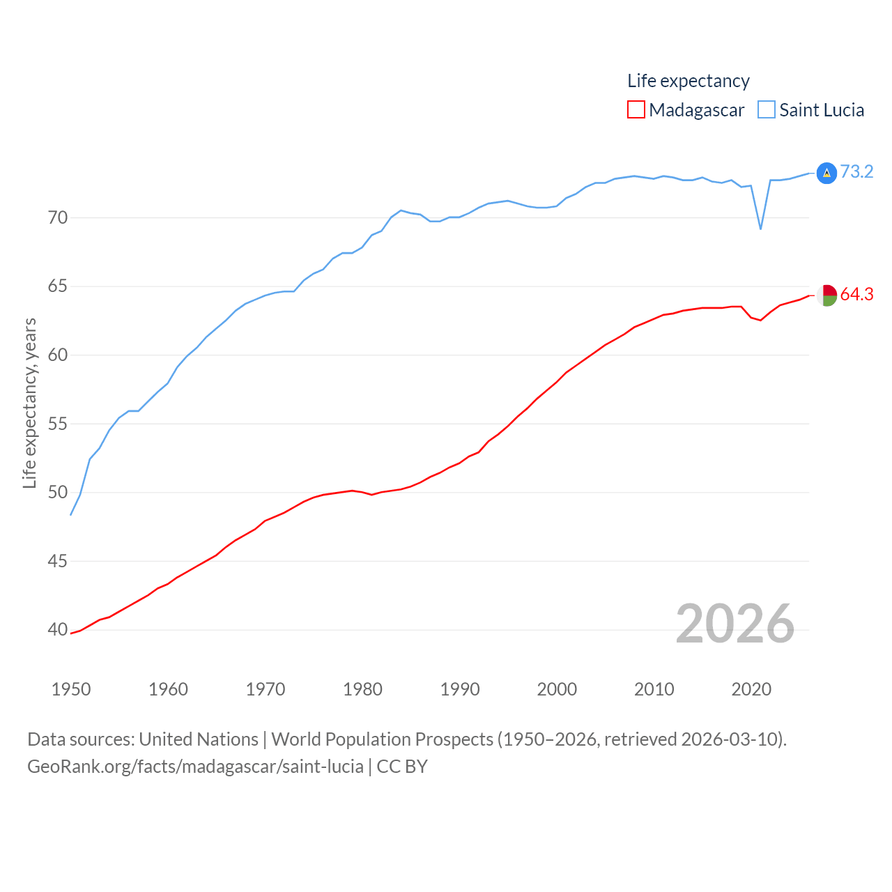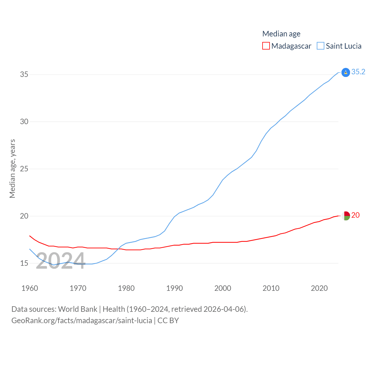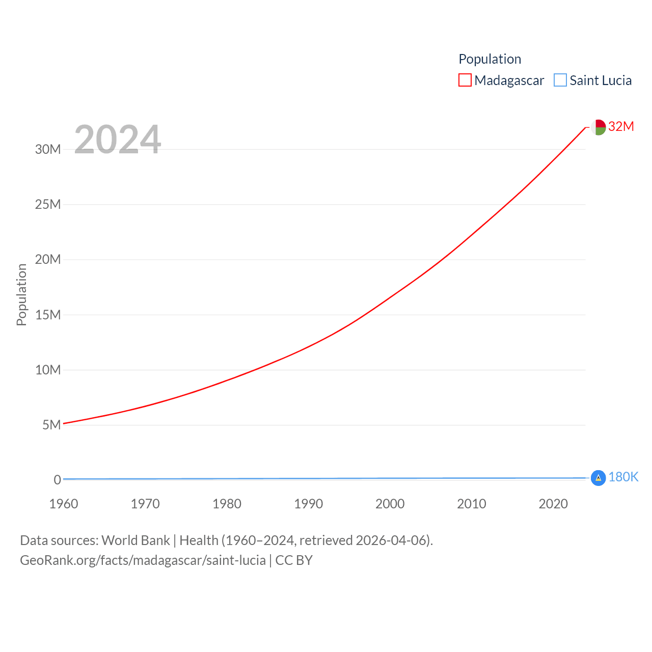 Madagascar has a population of 32M (ranked 49/197), compared with 180K in Saint Lucia (ranked 178/197). Madagascar's land area is 224,634 sq mi versus 235.5 sq mi for Saint Lucia (ranked 44th vs. 178th).