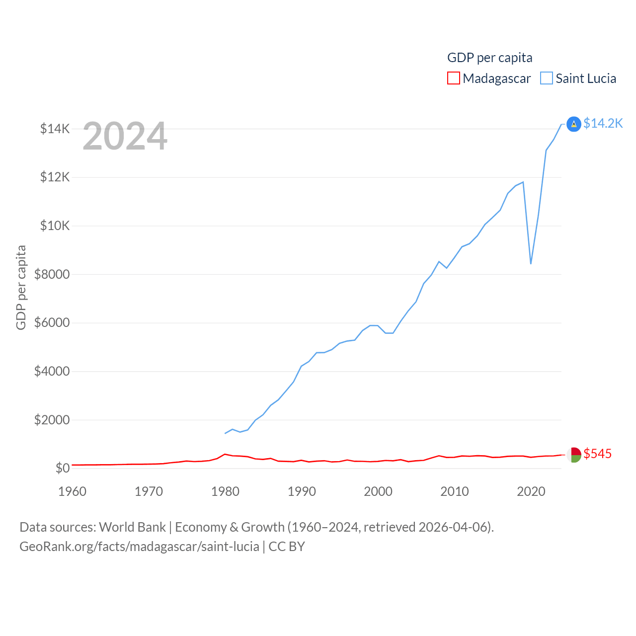 By GDP, Madagascar ranks 136/197 ($17.4B) and Saint Lucia ranks 173/197 ($2.55B). By GDP per capita, Madagascar ranks 193/197 ($545), while Saint Lucia ranks 70/197 ($14,182).