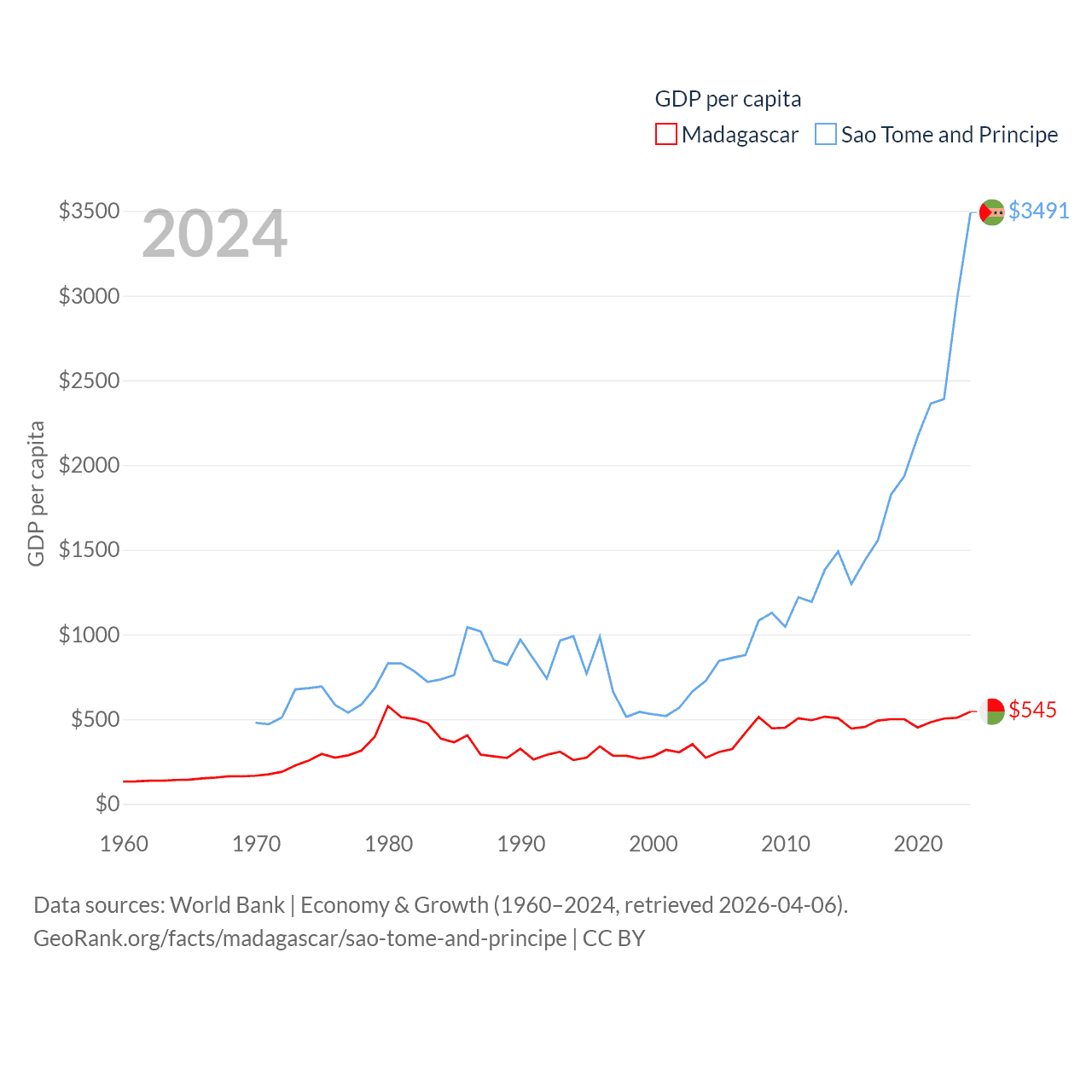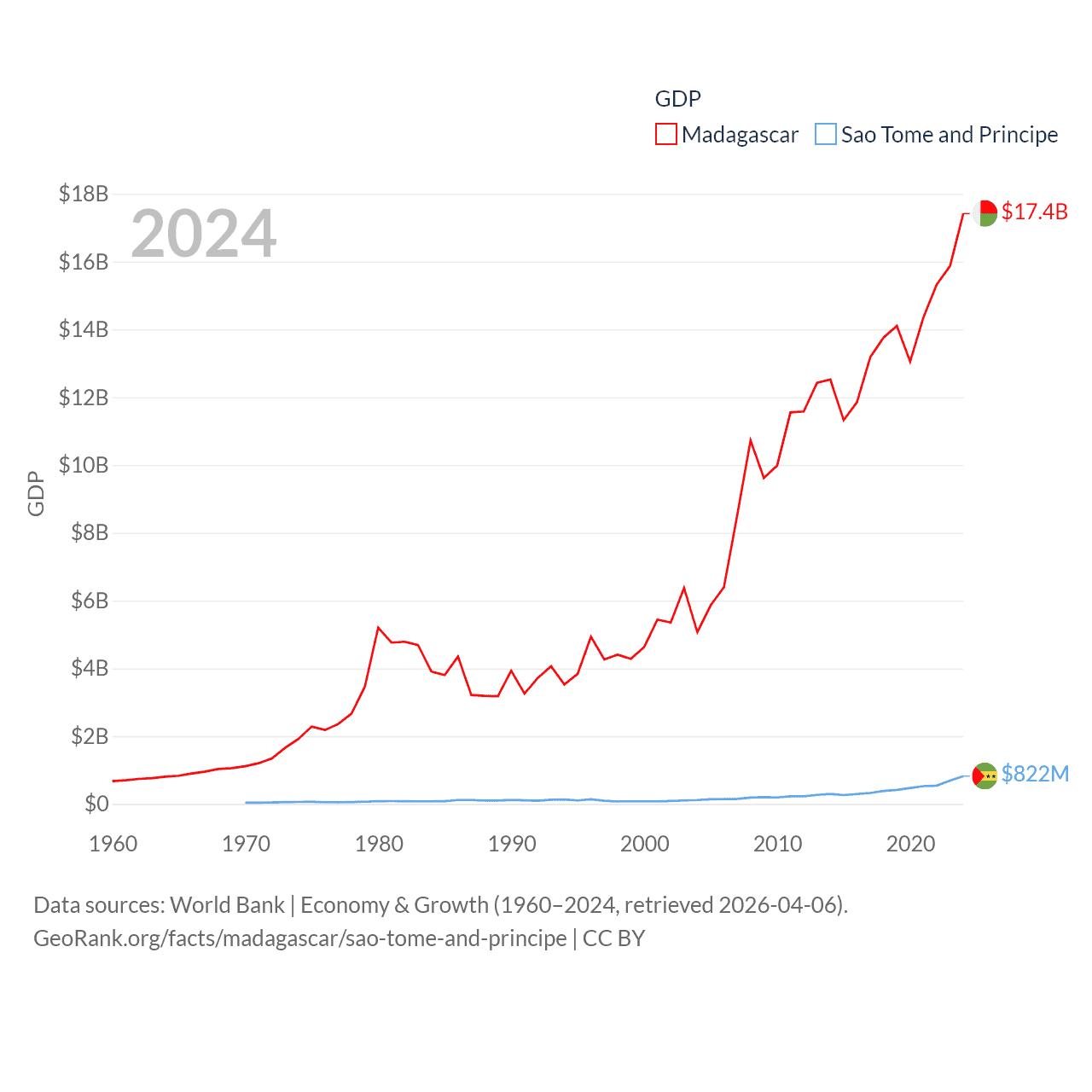 By GDP, Madagascar ranks 136/197 ($17.4B) and Sao Tome and Principe ranks 189/197 ($822M). By GDP per capita, Madagascar ranks 193/197 ($545), while Sao Tome and Principe ranks 134/197 ($3,491).