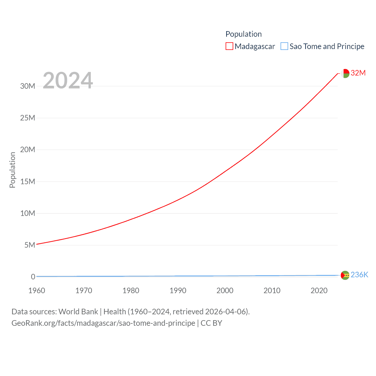 Madagascar has a population of 32M (ranked 49/197), compared with 236K in Sao Tome and Principe (ranked 176/197). Madagascar's land area is 224,634 sq mi versus 371 sq mi for Sao Tome and Principe (ranked 44th vs. 172nd).