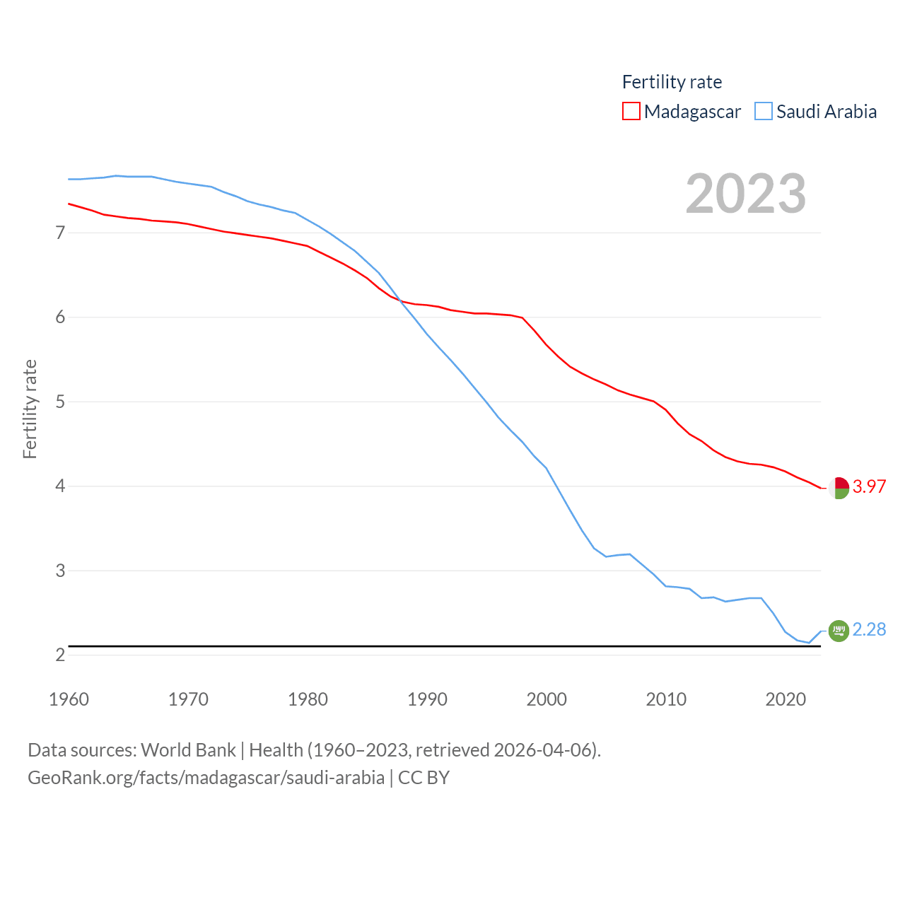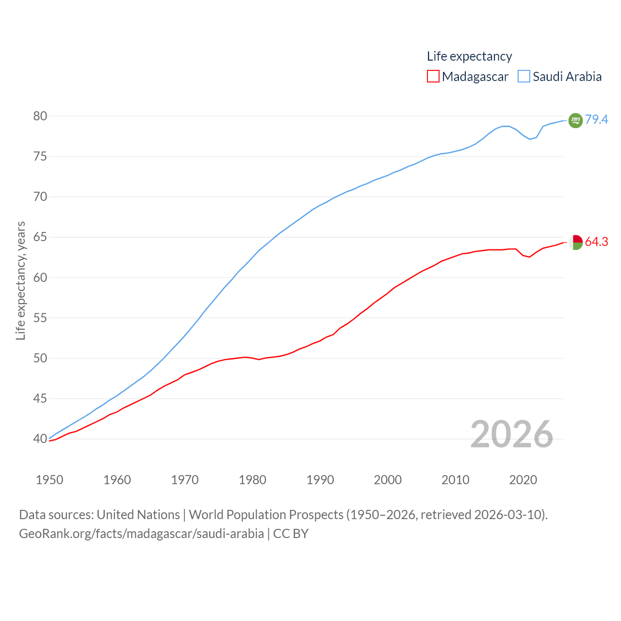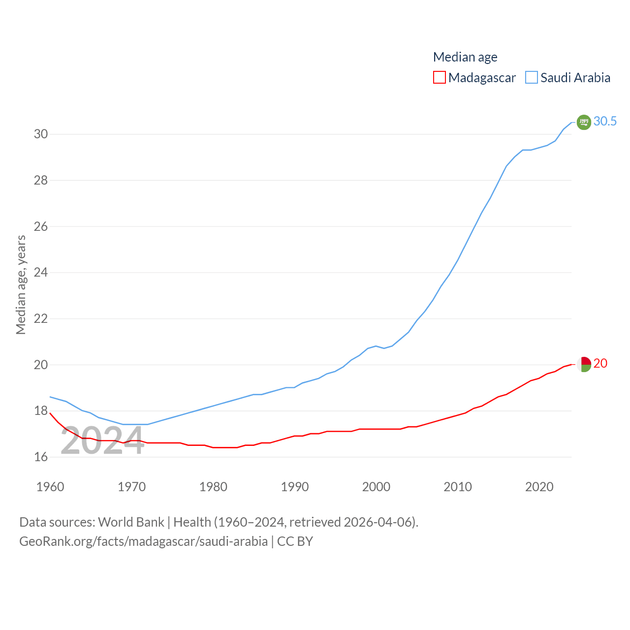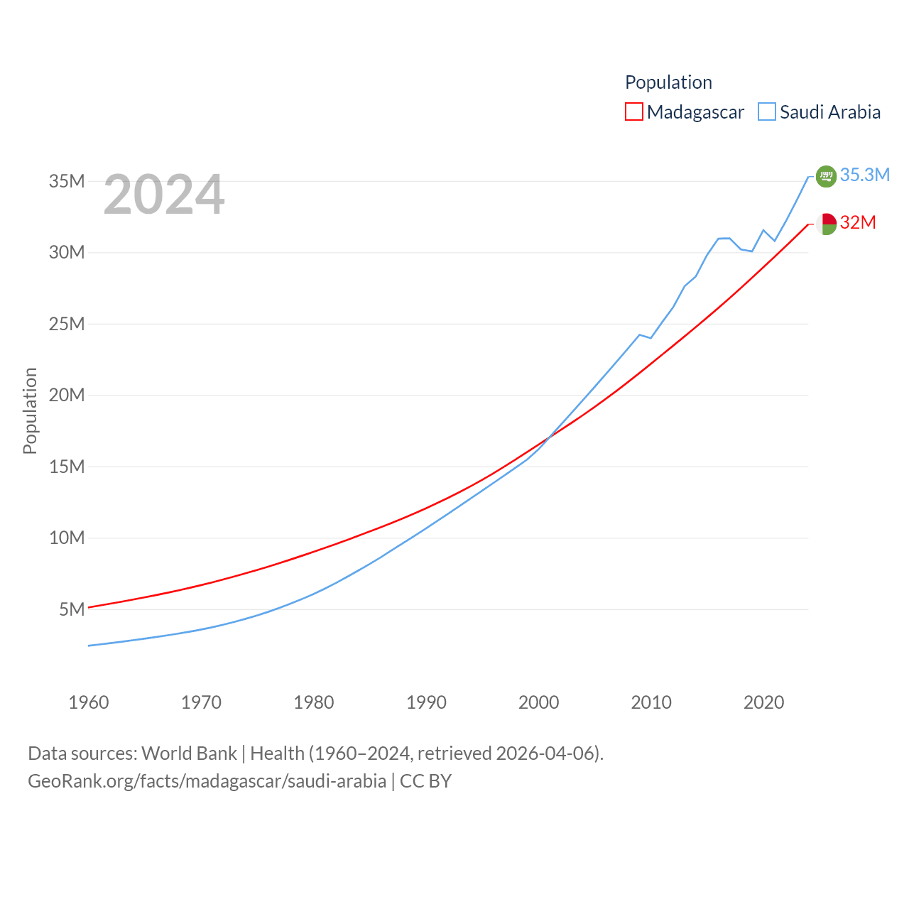 Madagascar has a population of 32M (ranked 49/197), compared with 35.3M in Saudi Arabia (ranked 45/197). Madagascar's land area is 224,634 sq mi versus 830,000 sq mi for Saudi Arabia (ranked 44th vs. 12th).