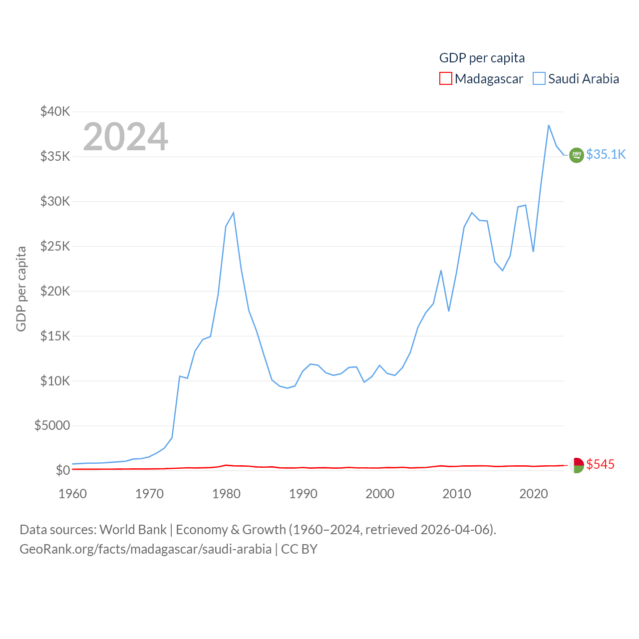 By GDP, Madagascar ranks 136/197 ($17.4B) and Saudi Arabia ranks 18/197 ($1.24T). By GDP per capita, Madagascar ranks 193/197 ($545), while Saudi Arabia ranks 33/197 ($35,122).