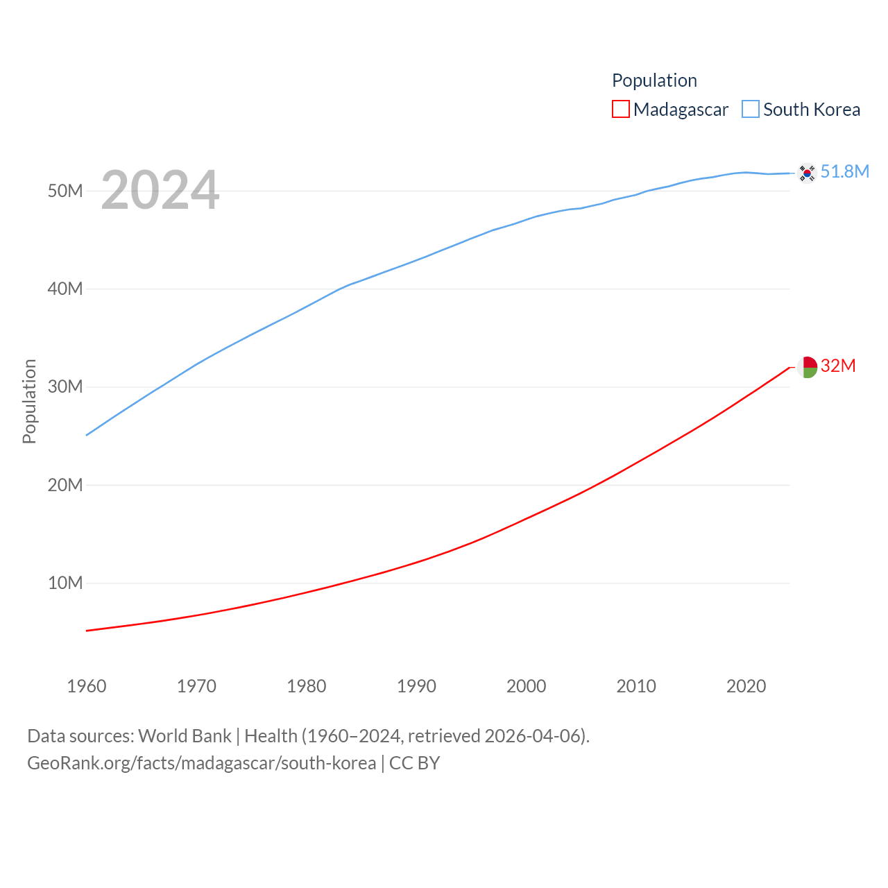 Madagascar has a population of 32M (ranked 49/197), compared with 51.8M in South Korea (ranked 29/197). Madagascar's land area is 224,634 sq mi versus 37,684 sq mi for South Korea (ranked 44th vs. 105th).