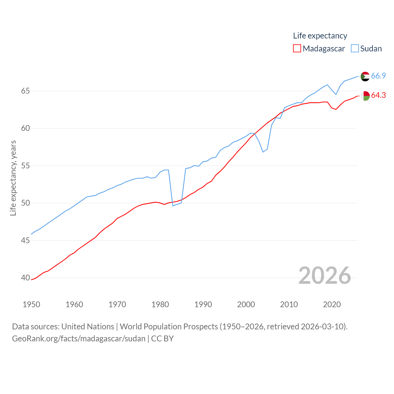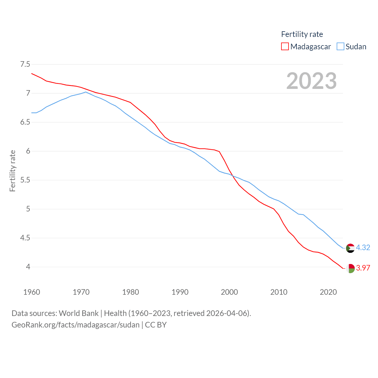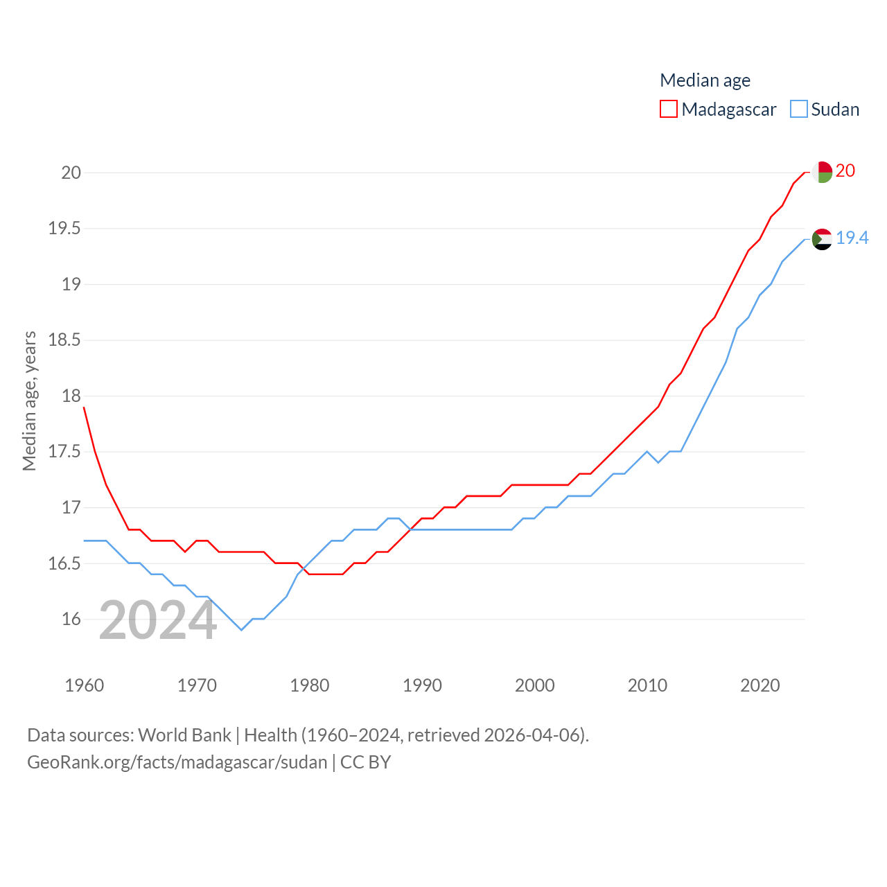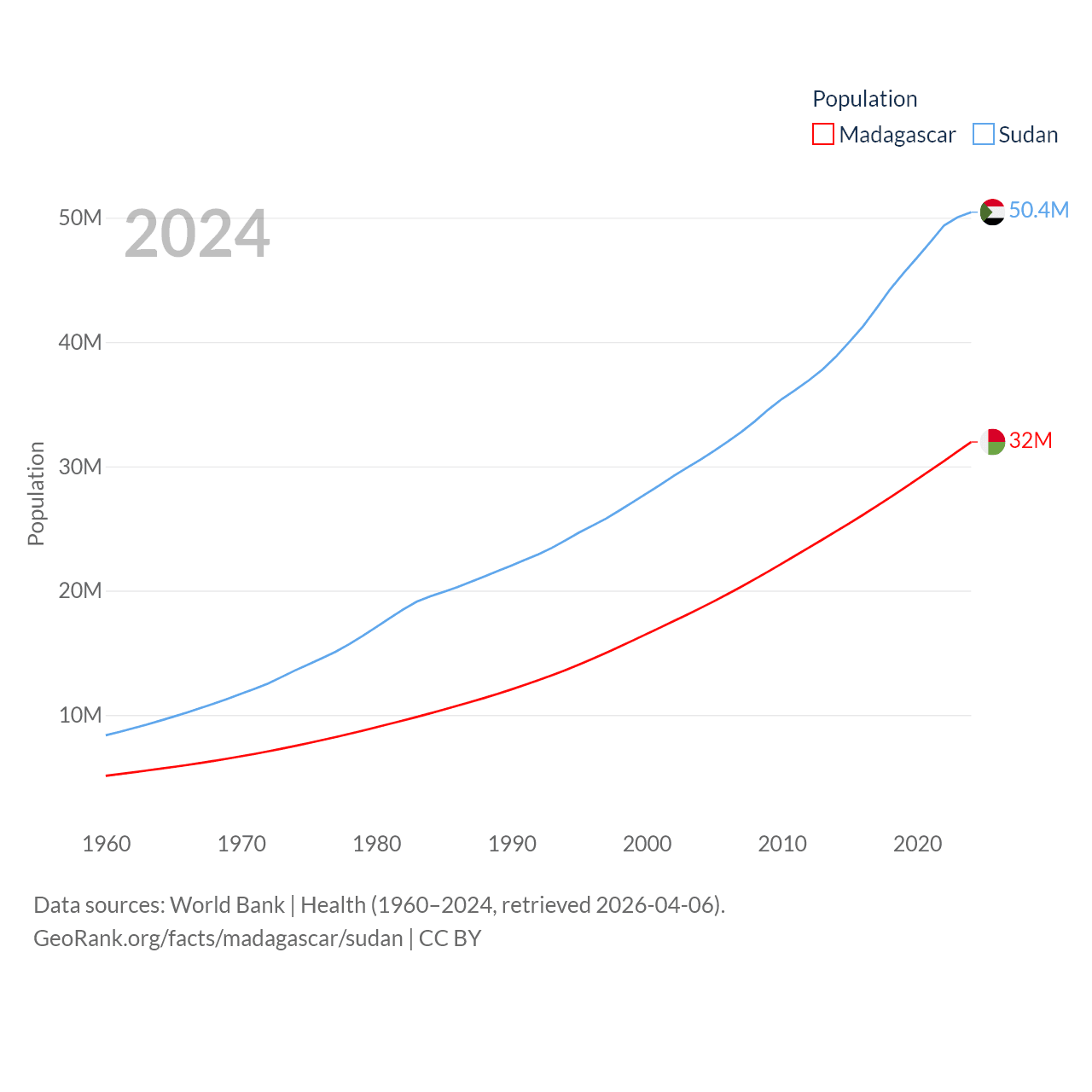 Madagascar has a population of 32M (ranked 49/197), compared with 50.4M in Sudan (ranked 30/197). Madagascar's land area is 224,634 sq mi versus 721,239 sq mi for Sudan (ranked 44th vs. 15th).