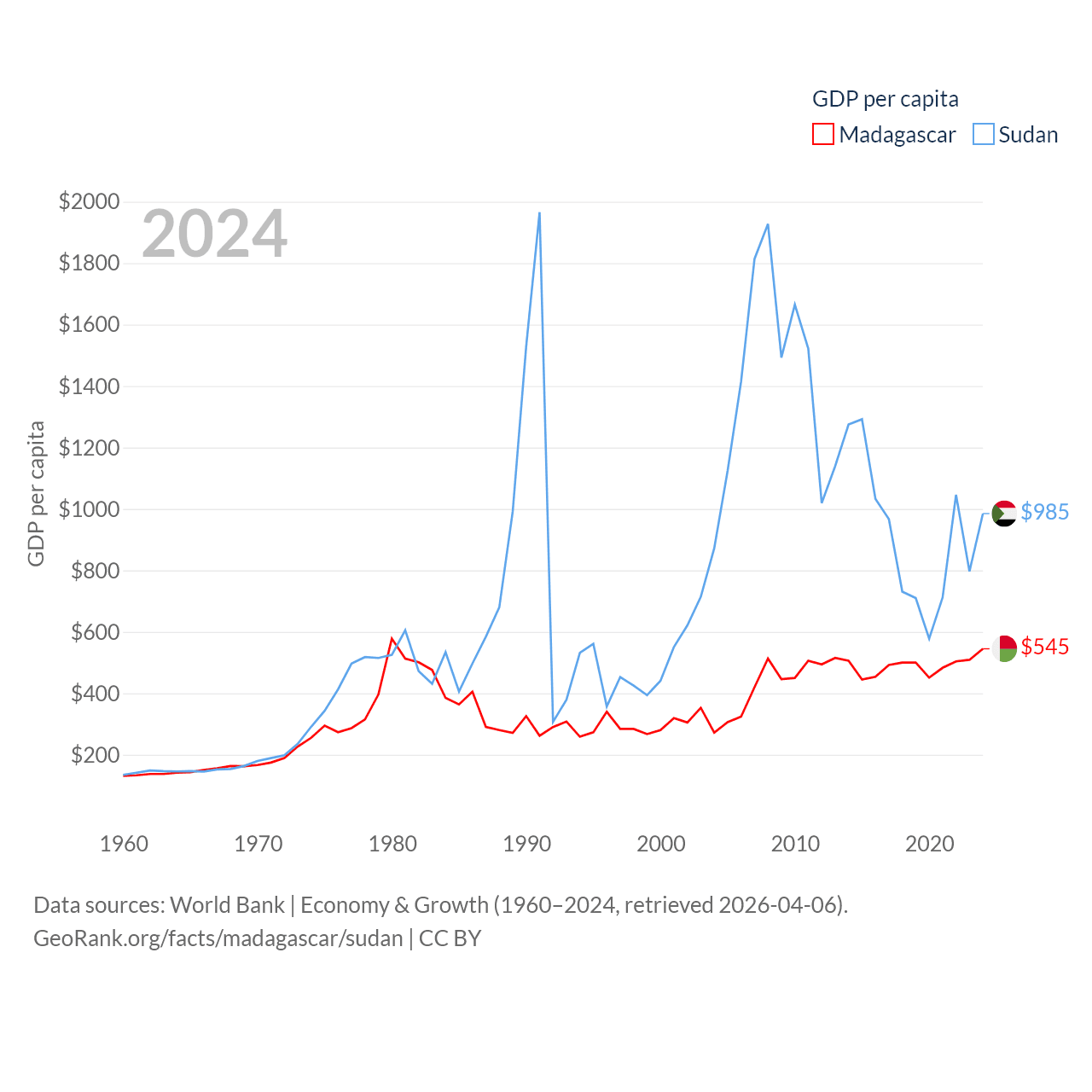 By GDP, Madagascar ranks 136/197 ($17.4B) and Sudan ranks 94/197 ($49.7B). By GDP per capita, Madagascar ranks 193/197 ($545), while Sudan ranks 179/197 ($985).