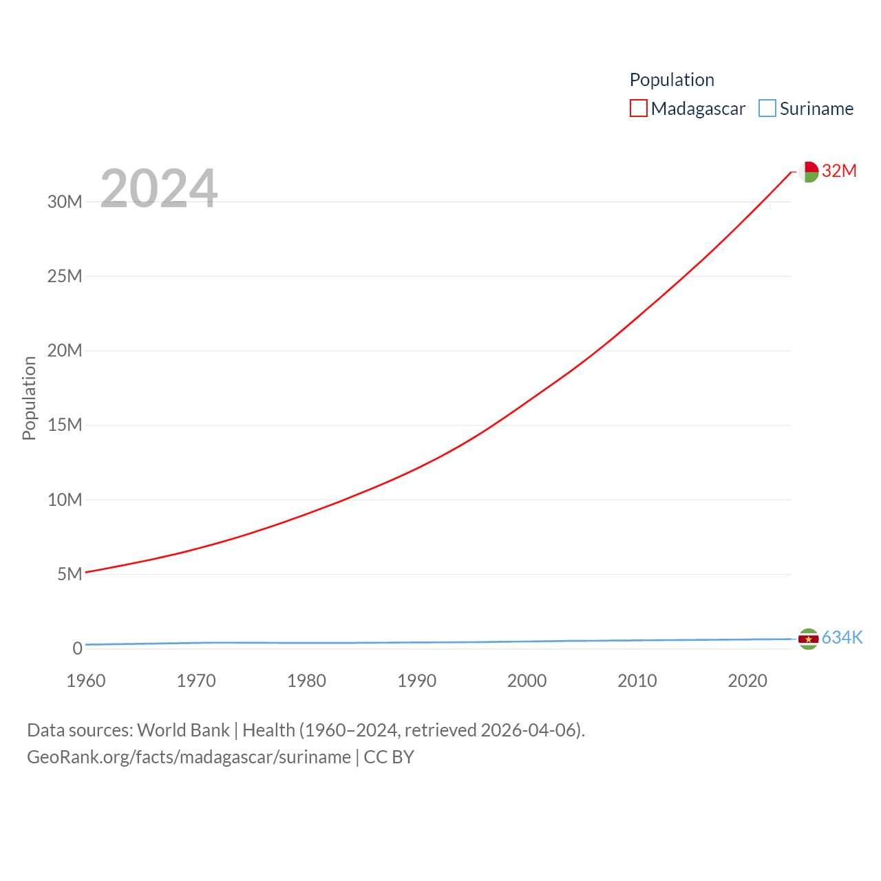 Madagascar has a population of 32M (ranked 49/197), compared with 634K in Suriname (ranked 165/197). Madagascar's land area is 224,634 sq mi versus 61,972 sq mi for Suriname (ranked 44th vs. 90th).