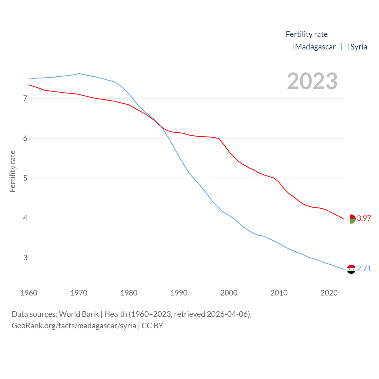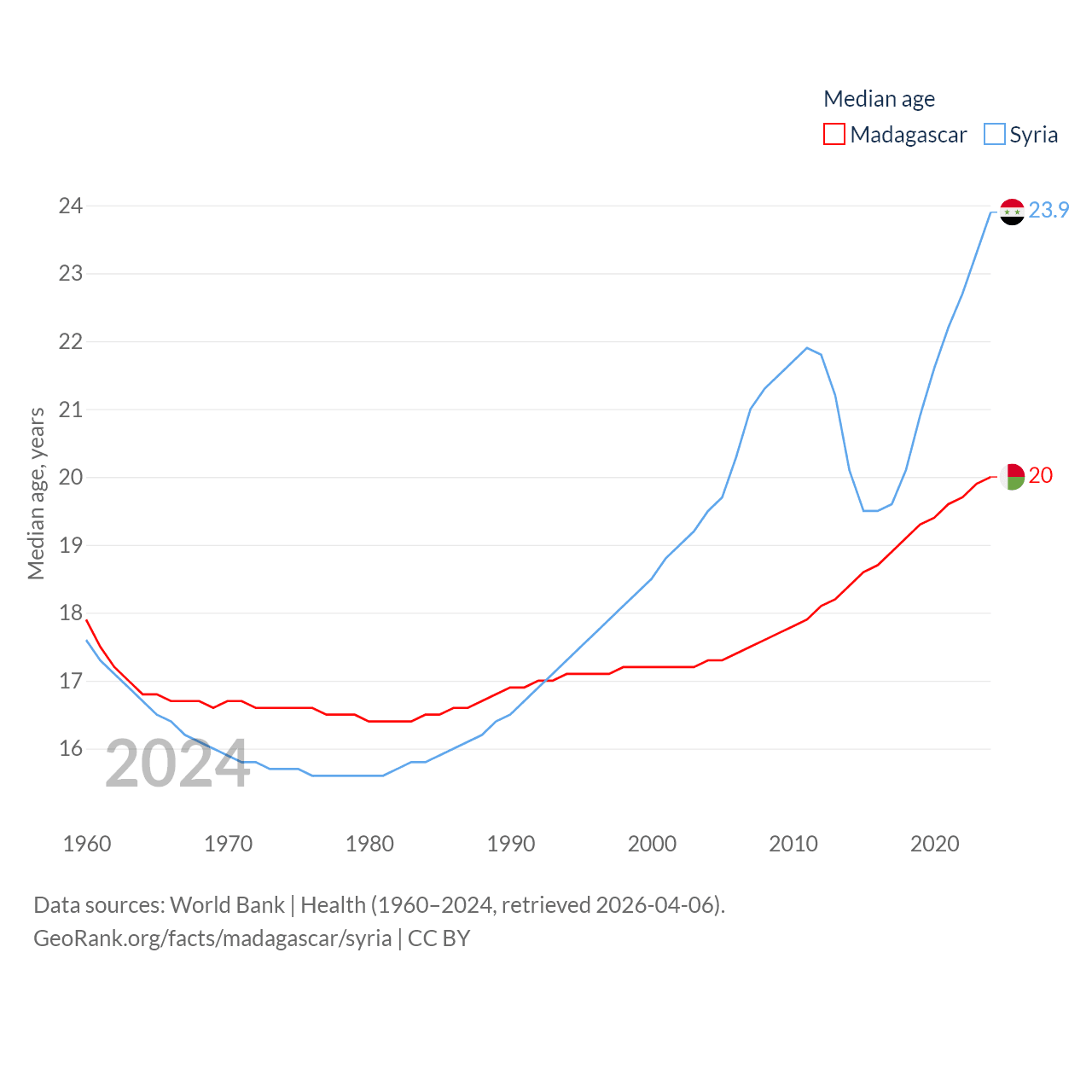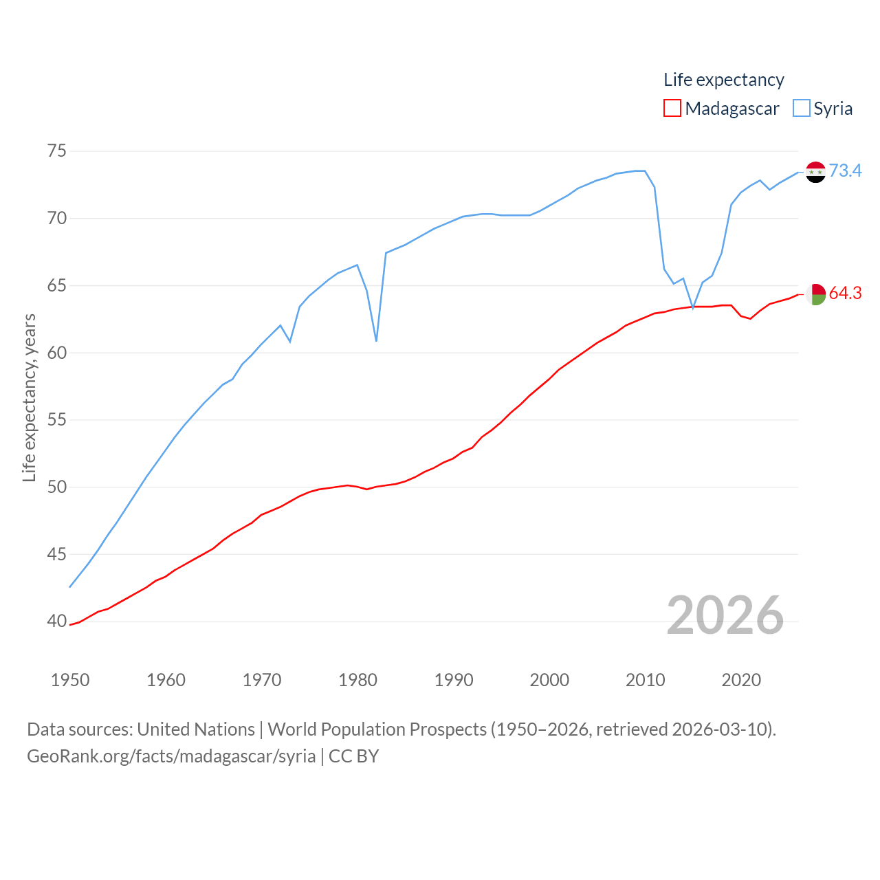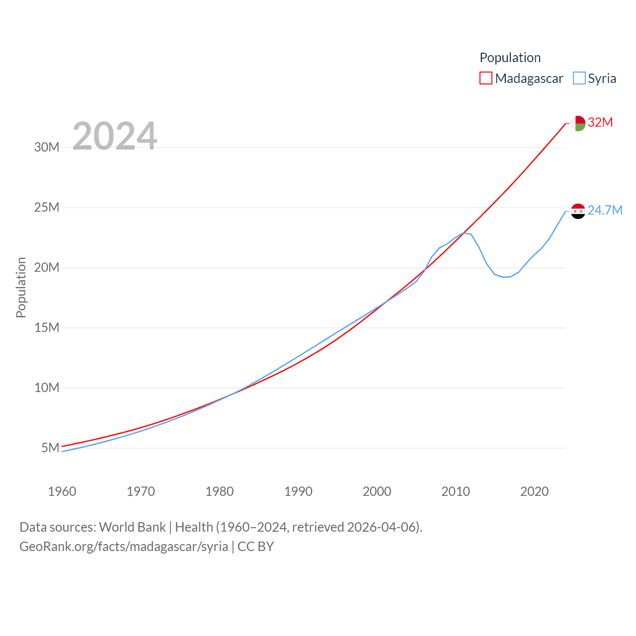 Madagascar has a population of 32M (ranked 49/197), compared with 24.7M in Syria (ranked 57/197). Madagascar's land area is 224,634 sq mi versus 70,900 sq mi for Syria (ranked 44th vs. 87th).