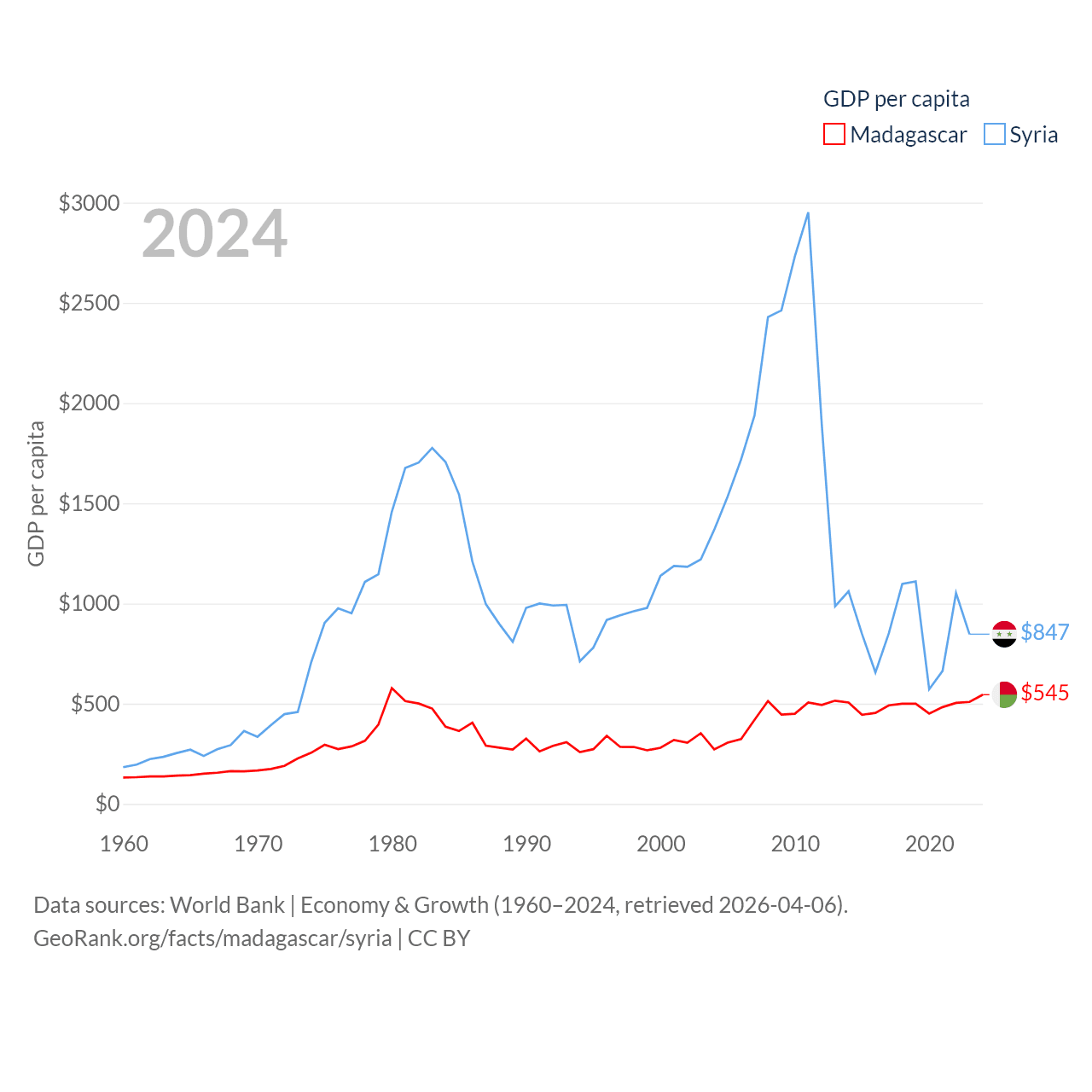 By GDP, Madagascar ranks 136/197 ($17.4B) and Syria ranks 129/197 ($20B). By GDP per capita, Madagascar ranks 193/197 ($545), while Syria ranks 185/197 ($847).