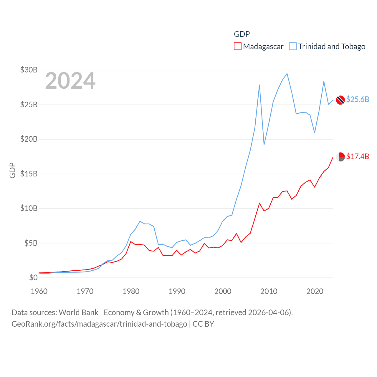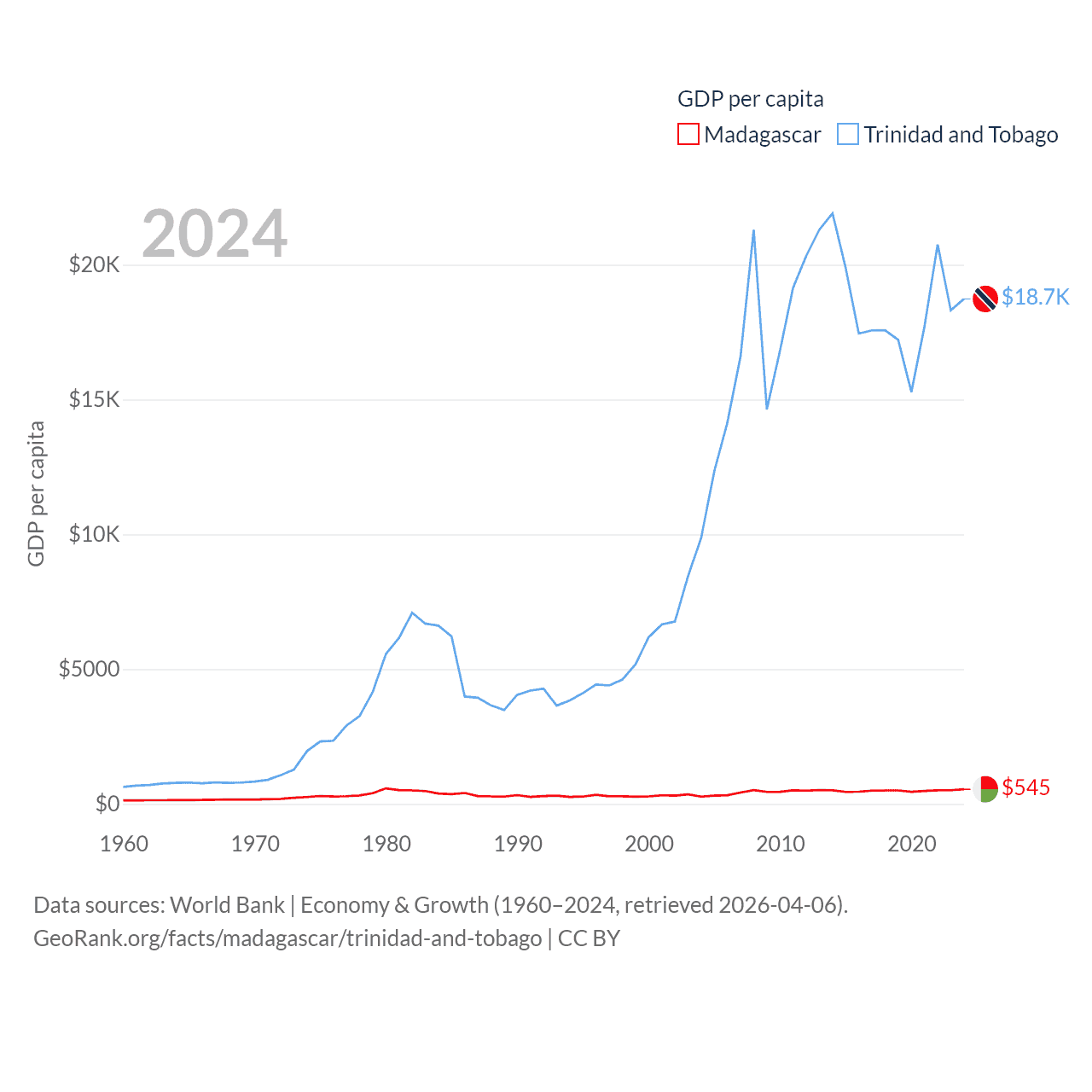 By GDP, Madagascar ranks 136/197 ($17.4B) and Trinidad and Tobago ranks 115/197 ($25.6B). By GDP per capita, Madagascar ranks 193/197 ($545), while Trinidad and Tobago ranks 61/197 ($18,733).