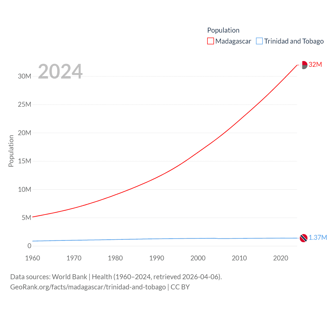 Madagascar has a population of 32M (ranked 49/197), compared with 1.37M in Trinidad and Tobago (ranked 154/197). Madagascar's land area is 224,634 sq mi versus 1,981 sq mi for Trinidad and Tobago (ranked 44th vs. 166th).