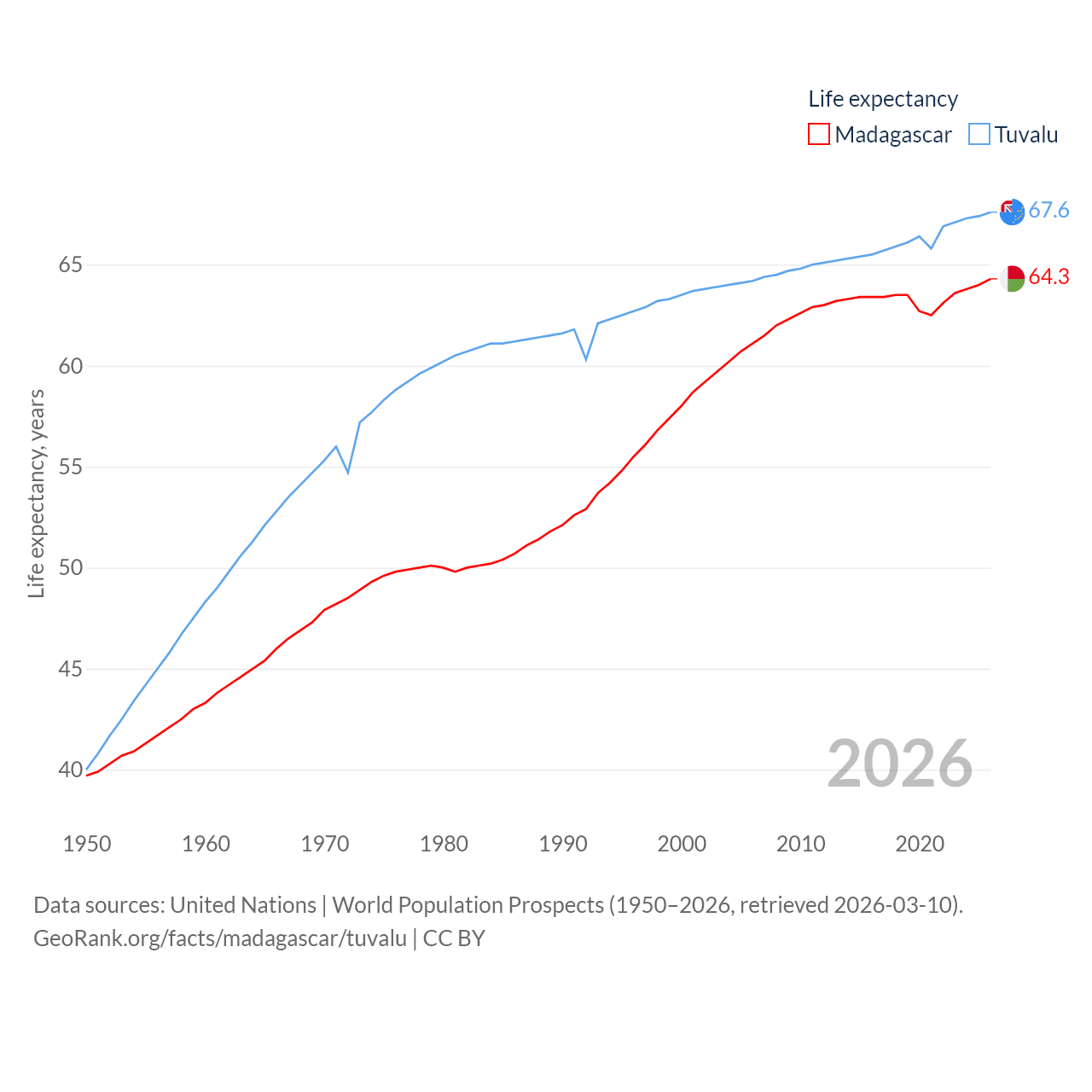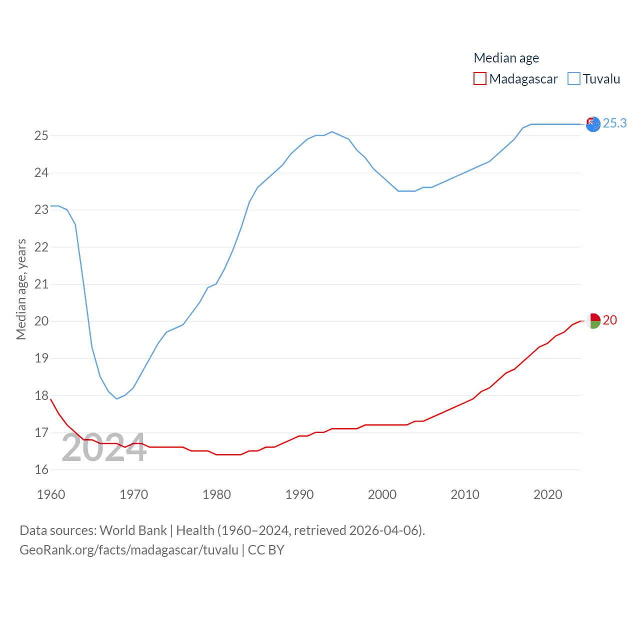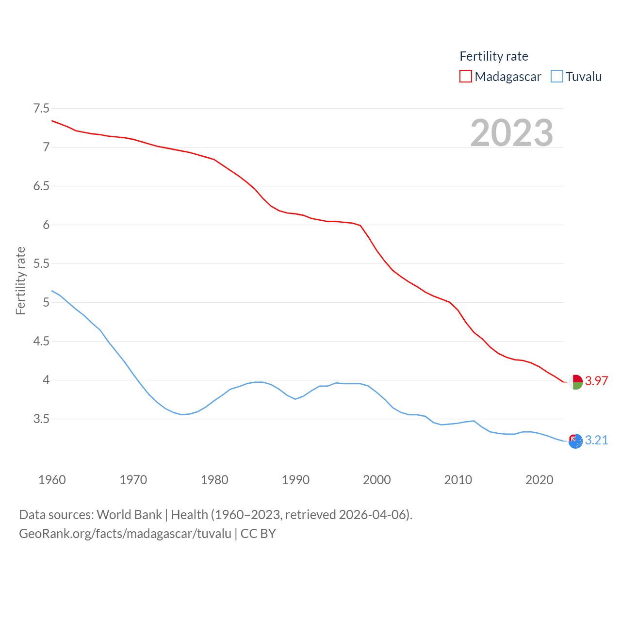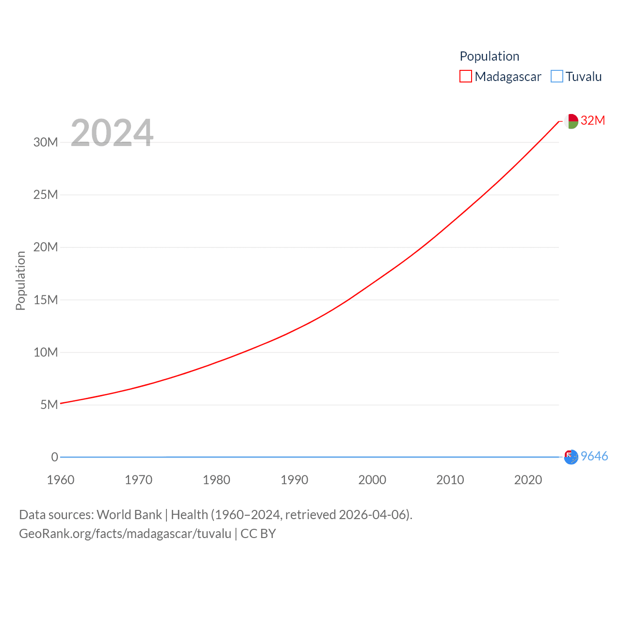 Madagascar has a population of 32M (ranked 49/197), compared with 9.65K in Tuvalu (ranked 196/197). Madagascar's land area is 224,634 sq mi versus 11.6 sq mi for Tuvalu (ranked 44th vs. 194th).