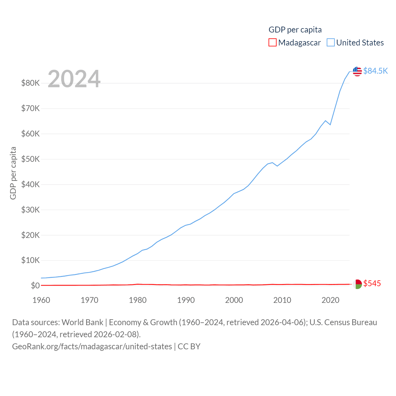 By GDP, Madagascar ranks 136/197 ($17.4B) and The United States ranks 1/197 ($28.8T). By GDP per capita, Madagascar ranks 193/197 ($545), while The United States ranks 10/197 ($84,534).