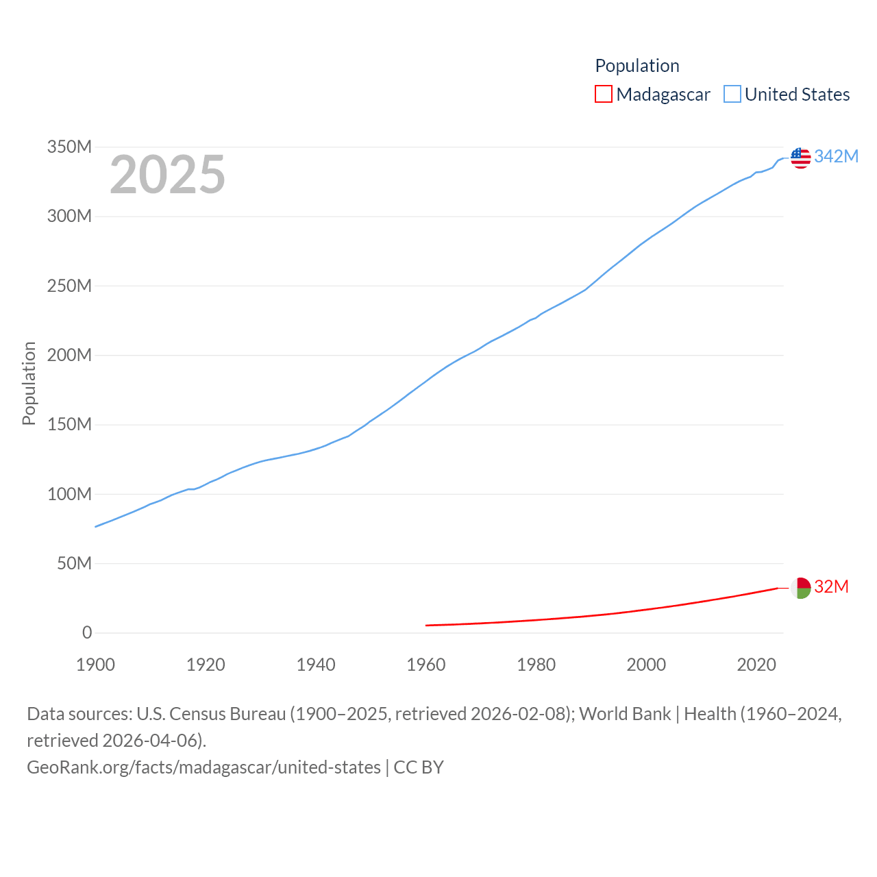 Madagascar has a population of 32M (ranked 49/197), compared with 342M in The United States (ranked 3/197). Madagascar's land area is 224,634 sq mi versus 3,531,839 sq mi for The United States (ranked 44th vs. 3rd).