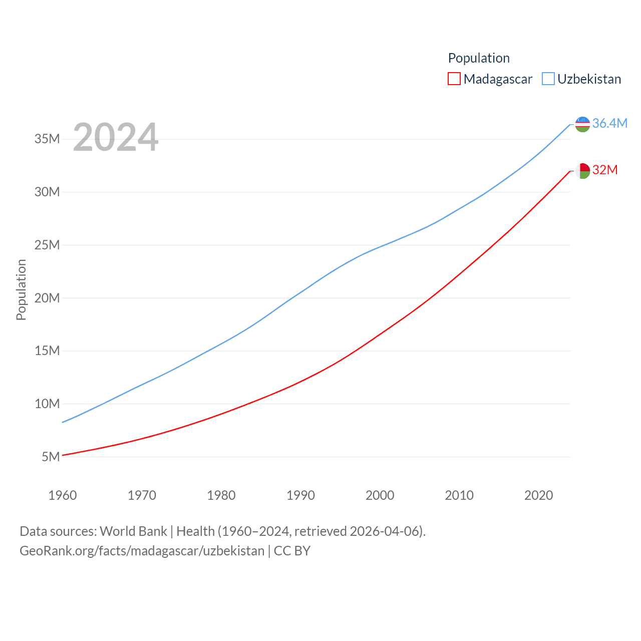 Madagascar has a population of 32M (ranked 49/197), compared with 36.4M in Uzbekistan (ranked 43/197). Madagascar's land area is 224,634 sq mi versus 170,136 sq mi for Uzbekistan (ranked 44th vs. 56th).