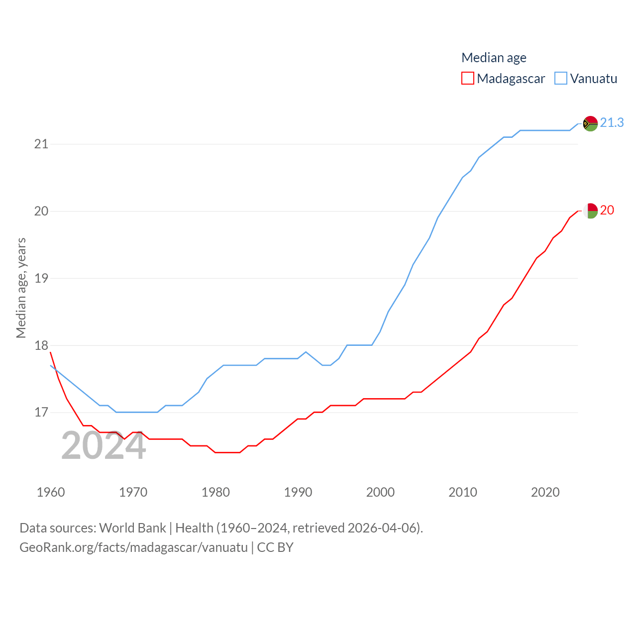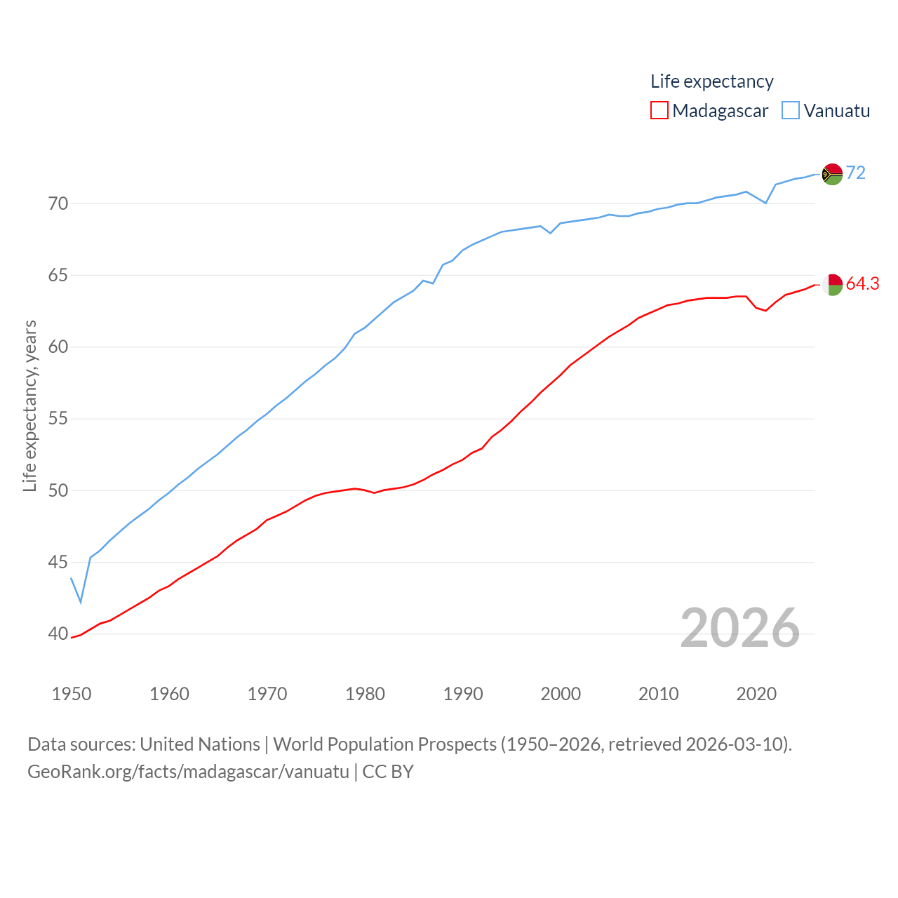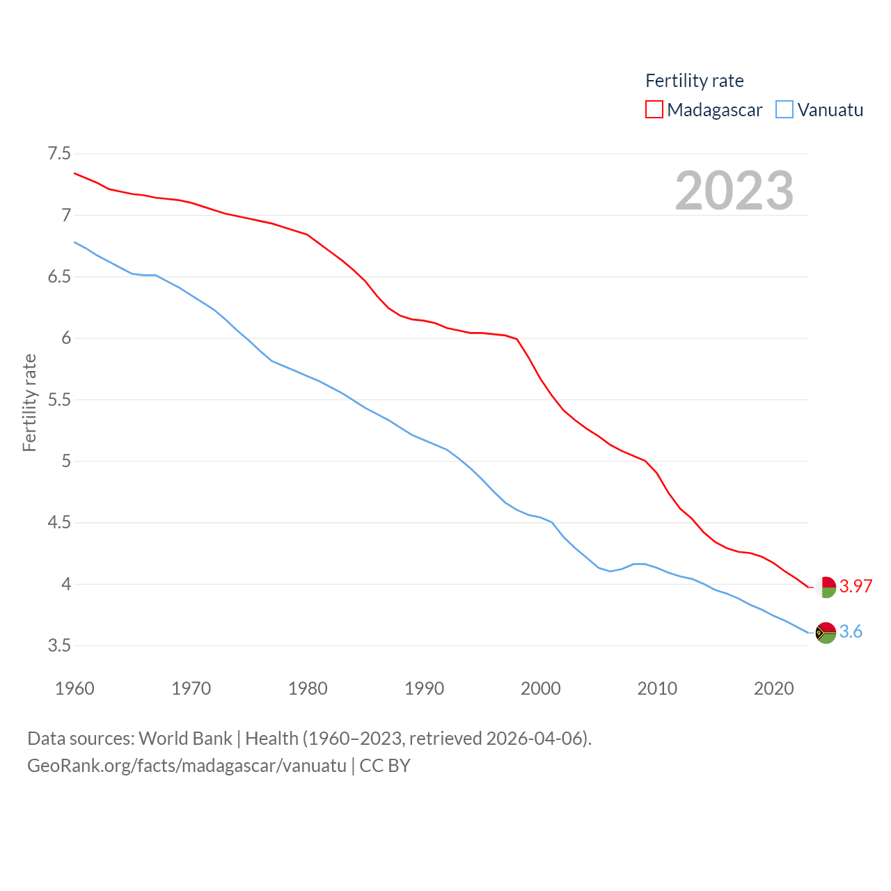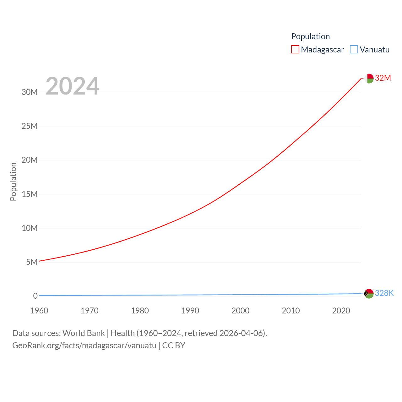 Madagascar has a population of 32M (ranked 49/197), compared with 328K in Vanuatu (ranked 174/197). Madagascar's land area is 224,634 sq mi versus 4,707 sq mi for Vanuatu (ranked 44th vs. 157th).
