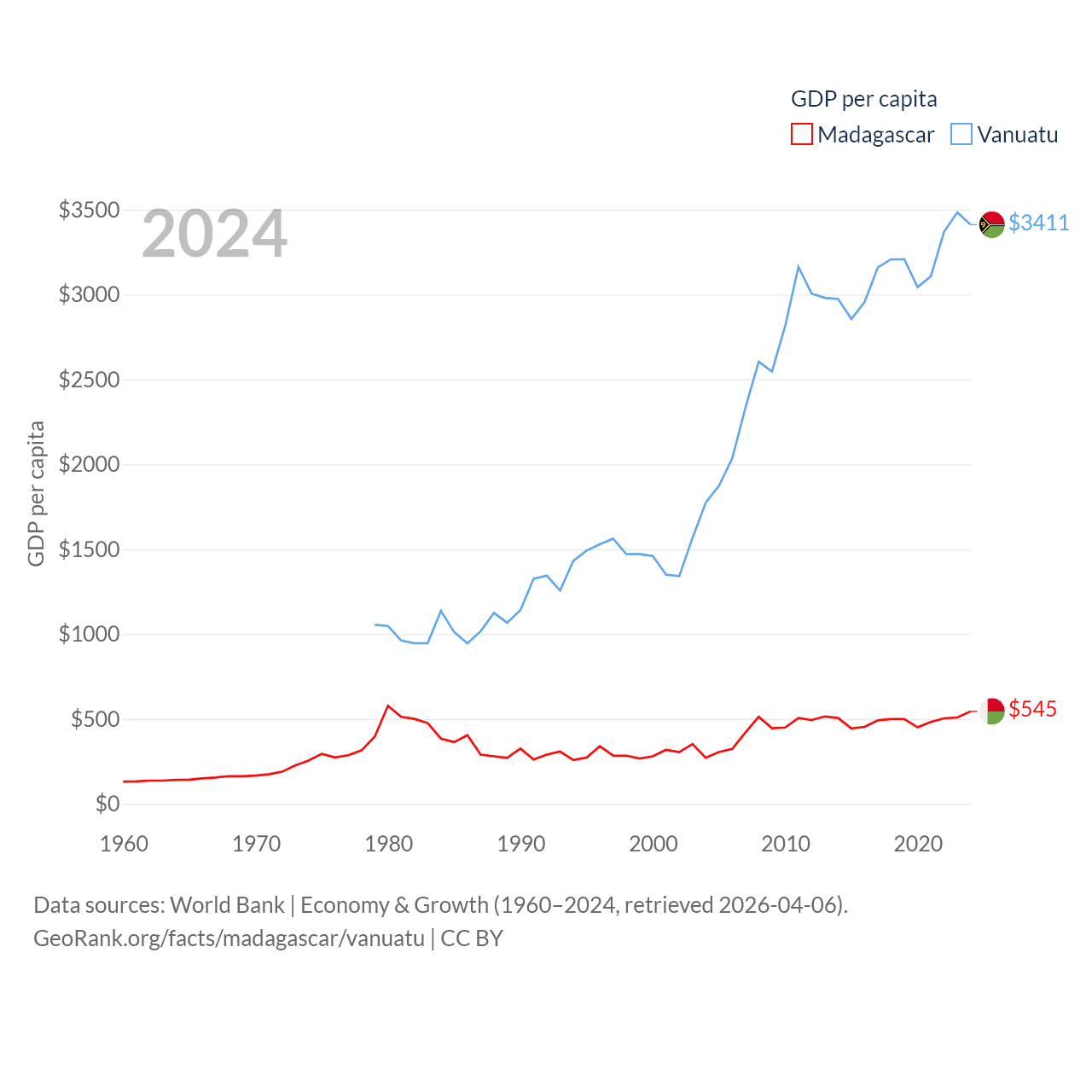 By GDP, Madagascar ranks 136/197 ($17.4B) and Vanuatu ranks 188/197 ($1.12B). By GDP per capita, Madagascar ranks 193/197 ($545), while Vanuatu ranks 137/197 ($3,411).