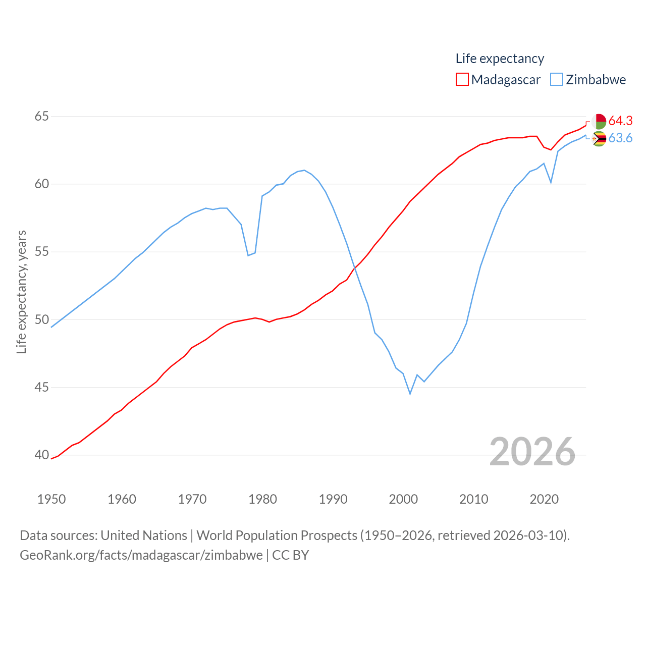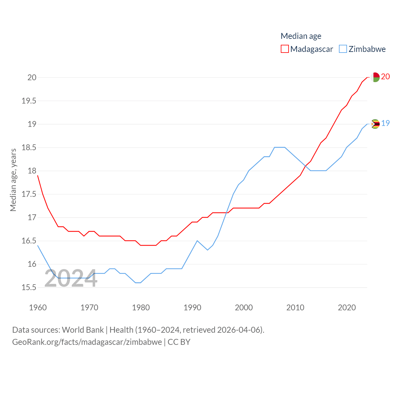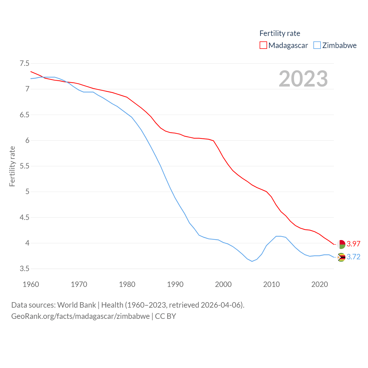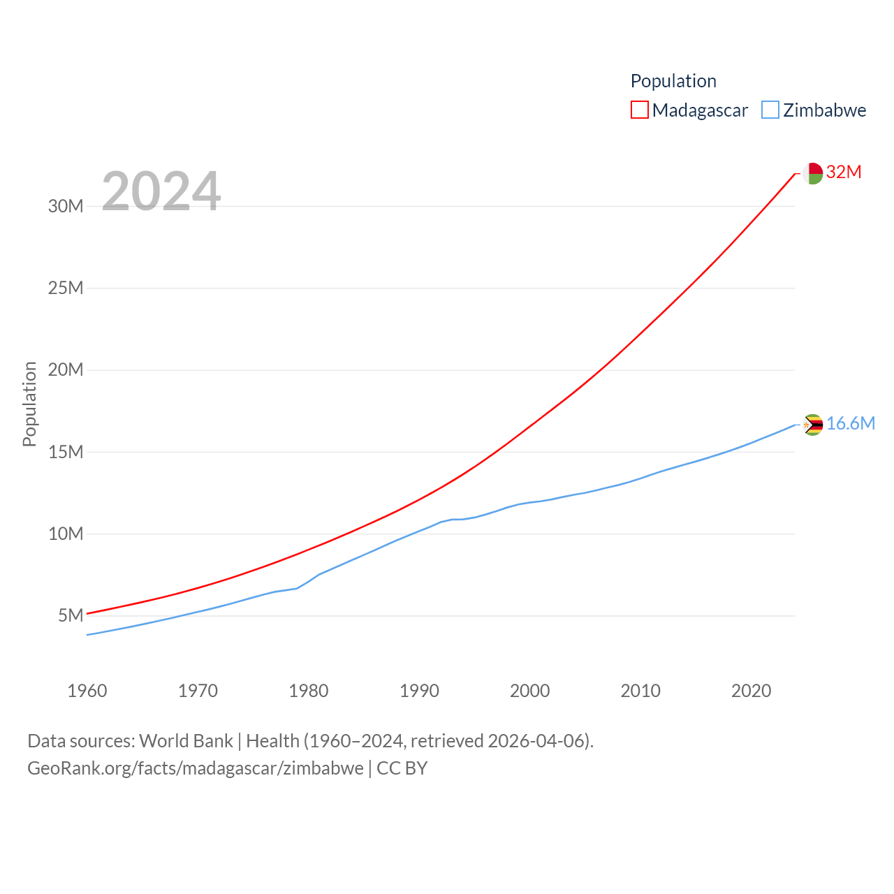 Madagascar has a population of 32M (ranked 49/197), compared with 16.6M in Zimbabwe (ranked 74/197). Madagascar's land area is 224,634 sq mi versus 149,364 sq mi for Zimbabwe (ranked 44th vs. 60th).