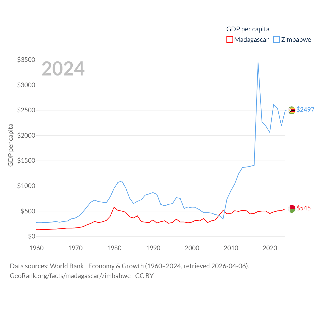 By GDP, Madagascar ranks 136/197 ($17.4B) and Zimbabwe ranks 102/197 ($41.5B). By GDP per capita, Madagascar ranks 193/197 ($545), while Zimbabwe ranks 148/197 ($2,497).
