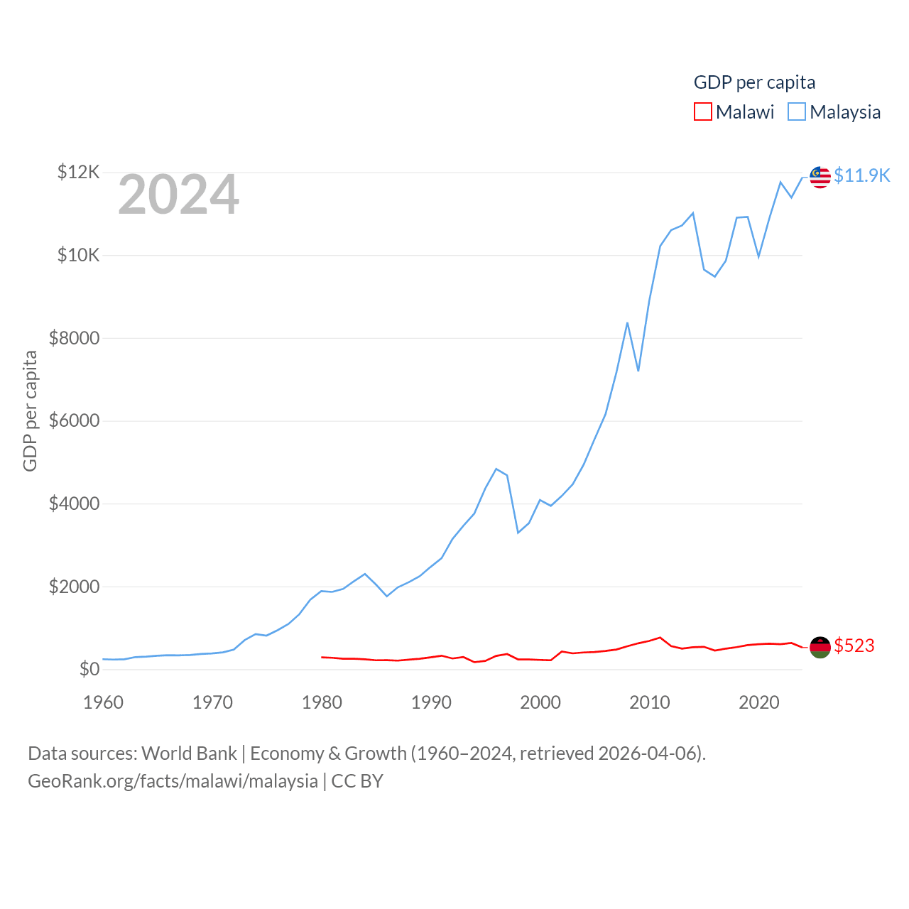 By GDP, Malawi ranks 151/197 ($11.3B) and Malaysia ranks 38/197 ($422B). By GDP per capita, Malawi ranks 194/197 ($523), while Malaysia ranks 79/197 ($11,874).