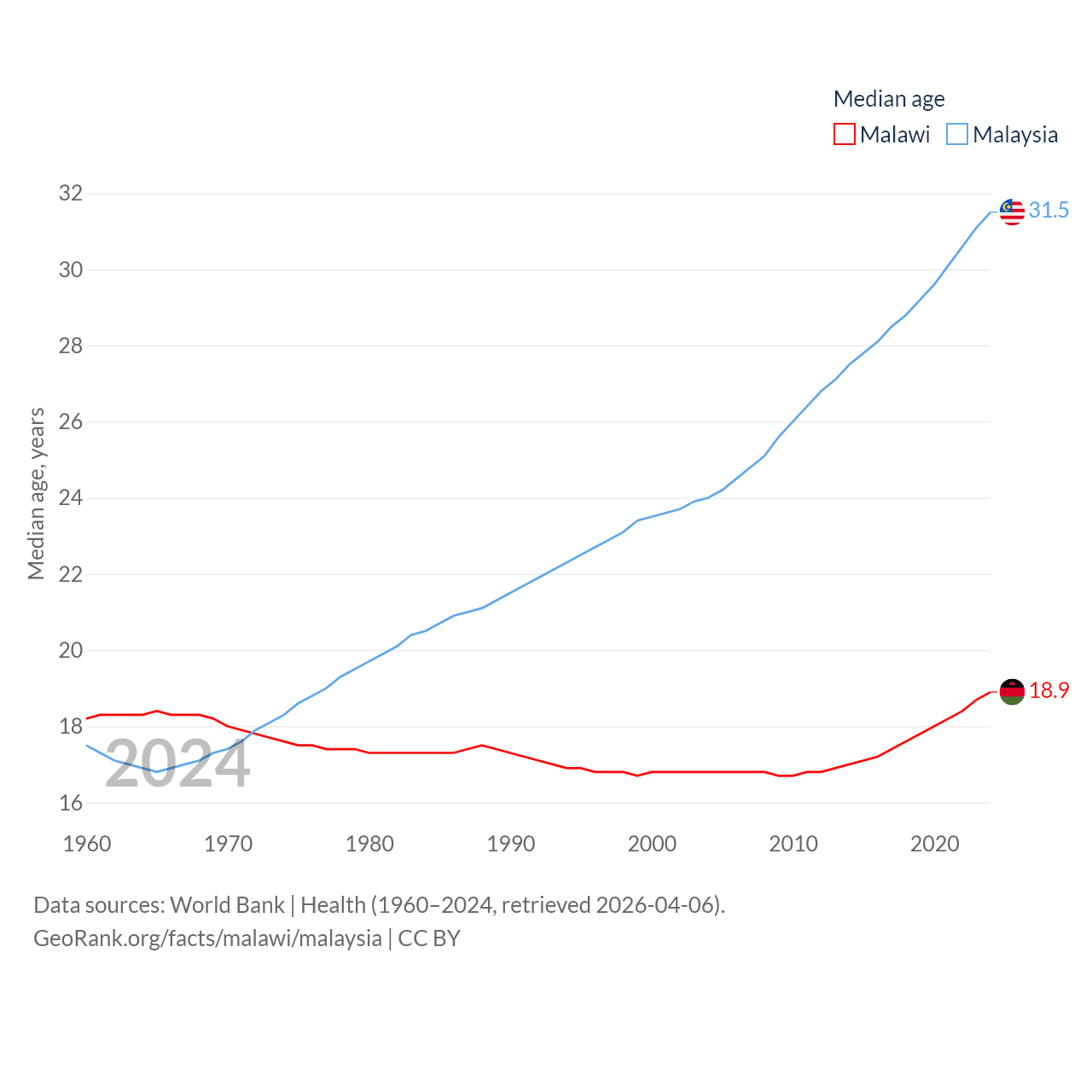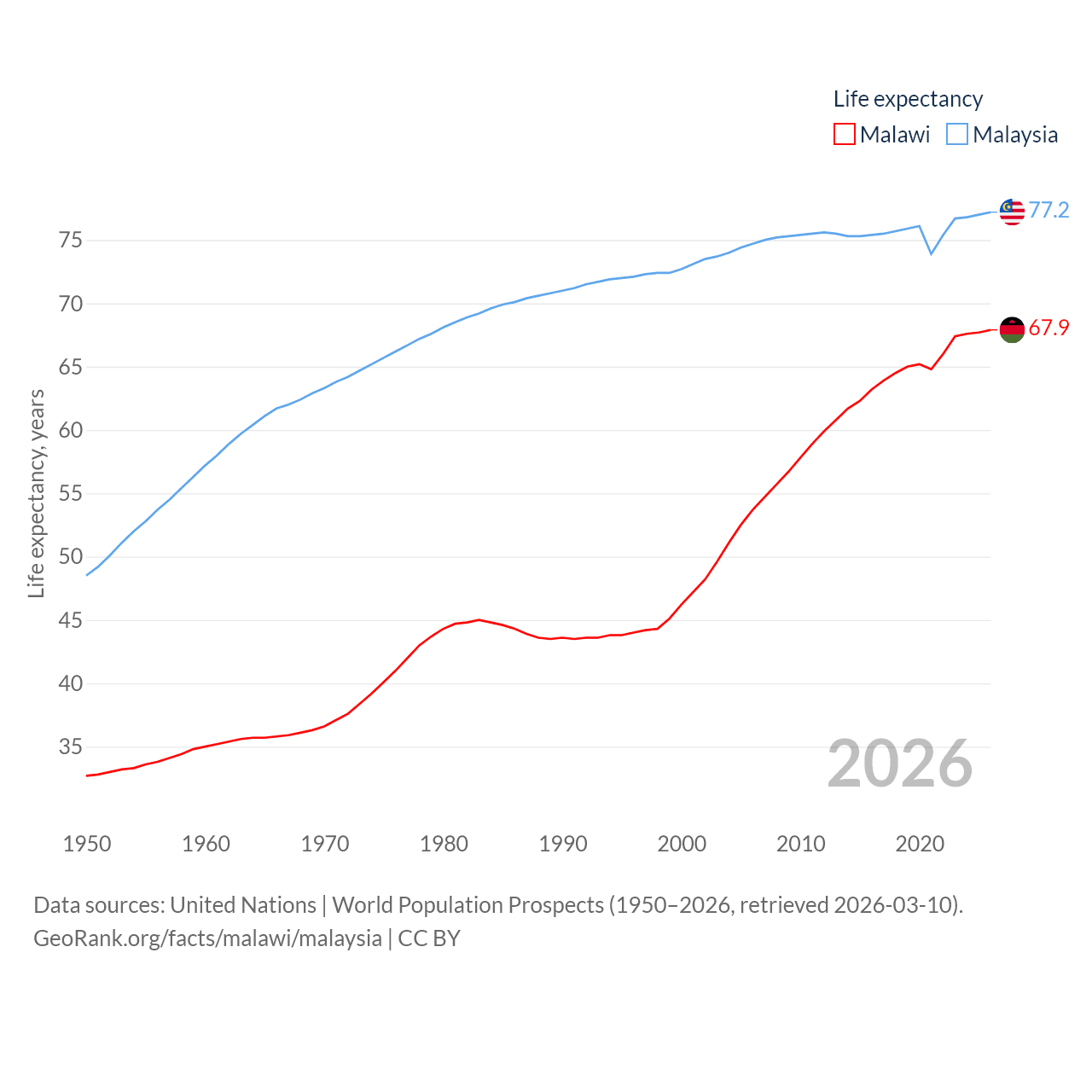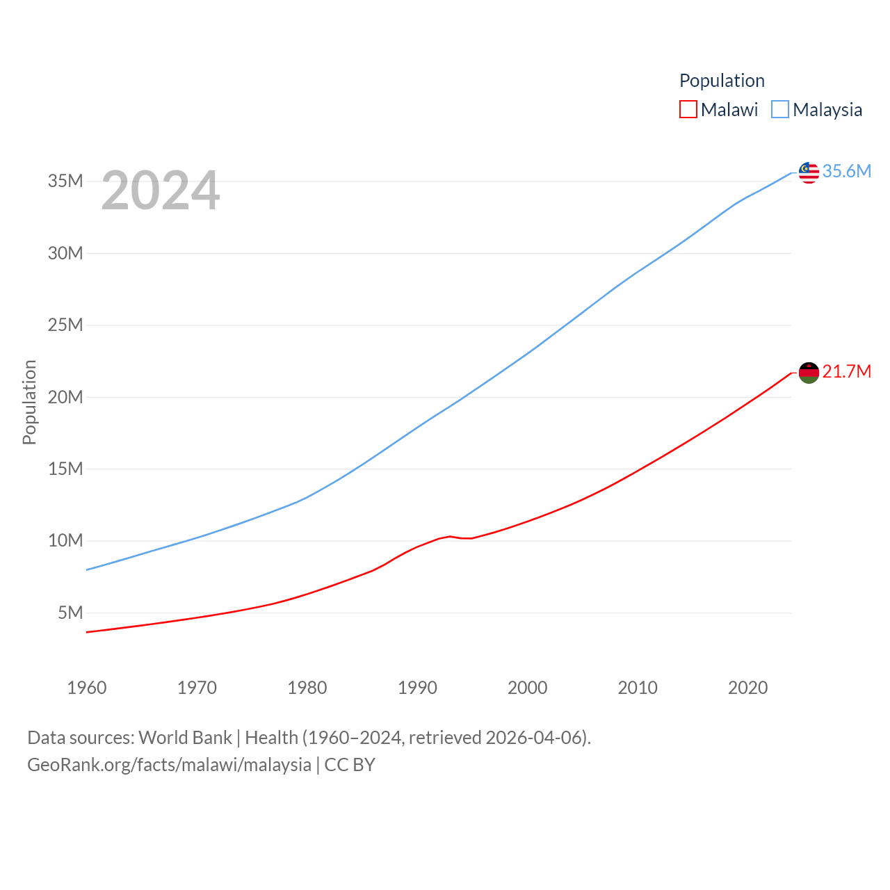 Malawi has a population of 21.7M (ranked 62/197), compared with 35.6M in Malaysia (ranked 44/197). Malawi's land area is 36,402 sq mi versus 126,854 sq mi for Malaysia (ranked 107th vs. 65th).