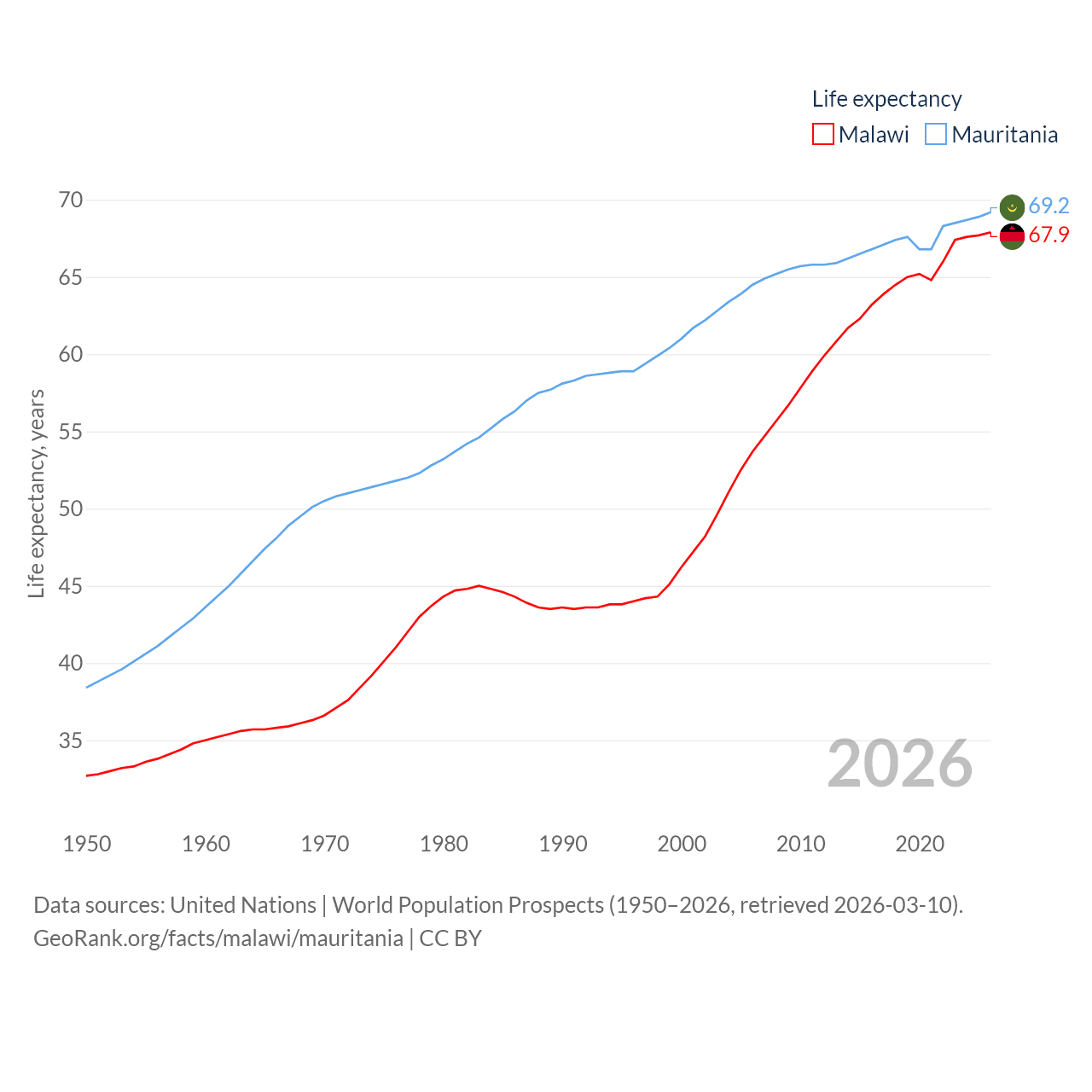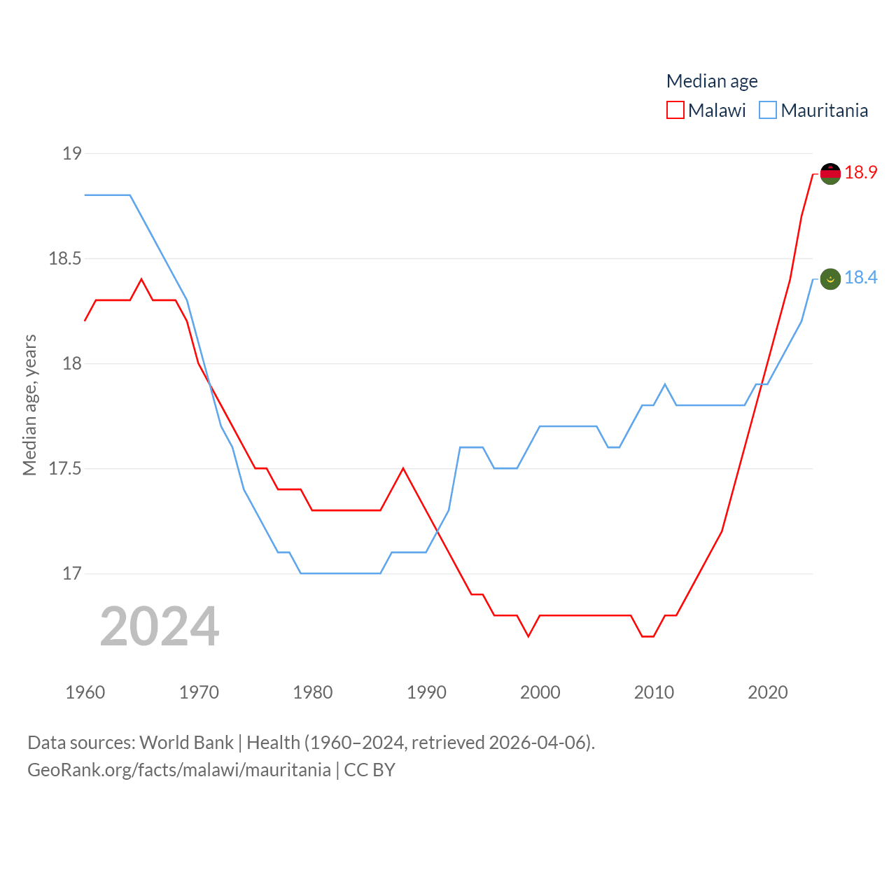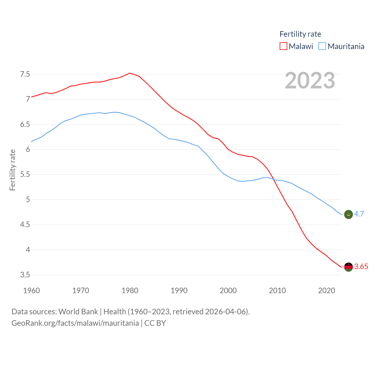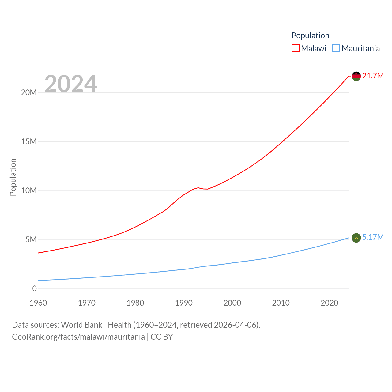 Malawi has a population of 21.7M (ranked 62/197), compared with 5.17M in Mauritania (ranked 125/197). Malawi's land area is 36,402 sq mi versus 397,955 sq mi for Mauritania (ranked 107th vs. 28th).