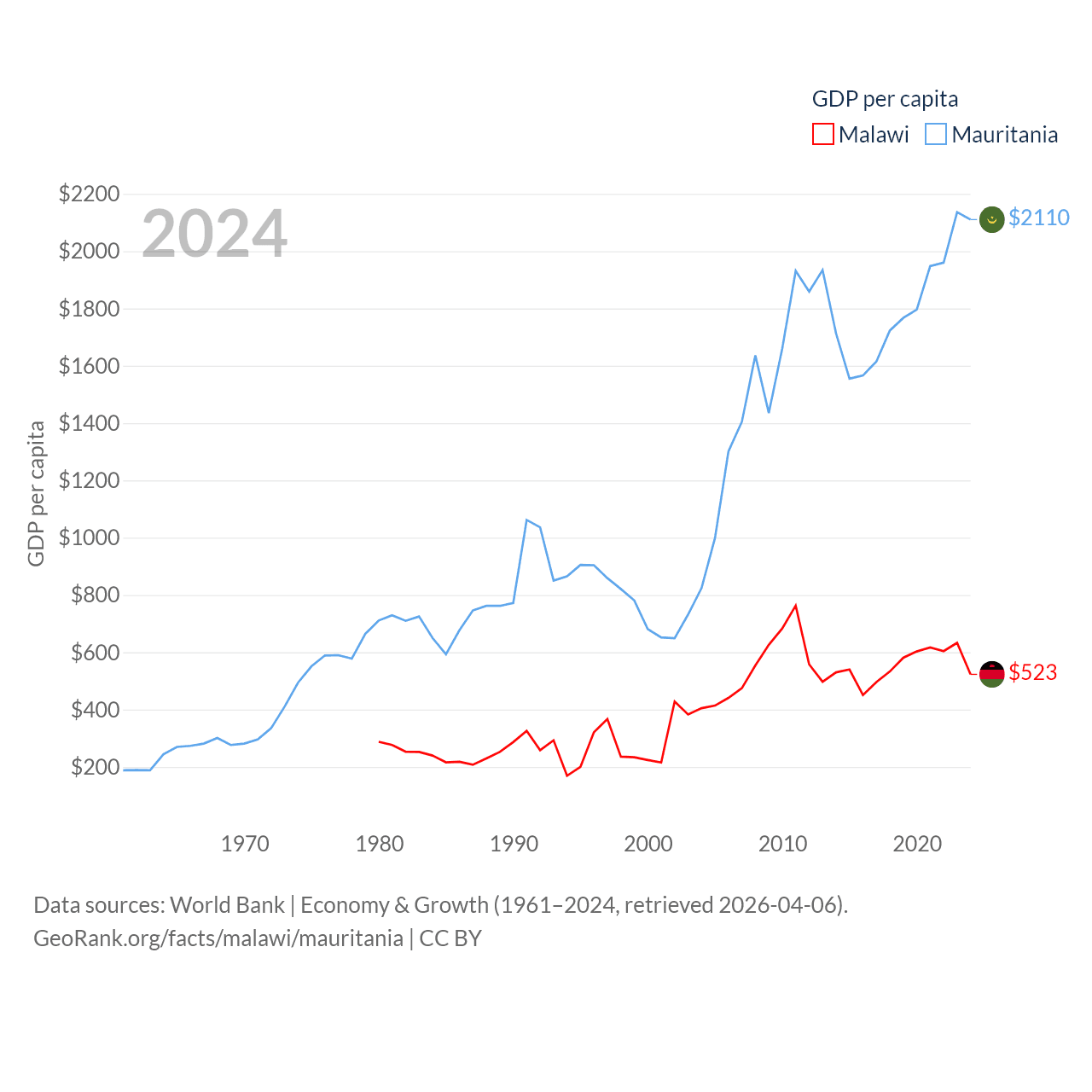 By GDP, Malawi ranks 151/197 ($11.3B) and Mauritania ranks 153/197 ($10.9B). By GDP per capita, Malawi ranks 194/197 ($523), while Mauritania ranks 156/197 ($2,110).