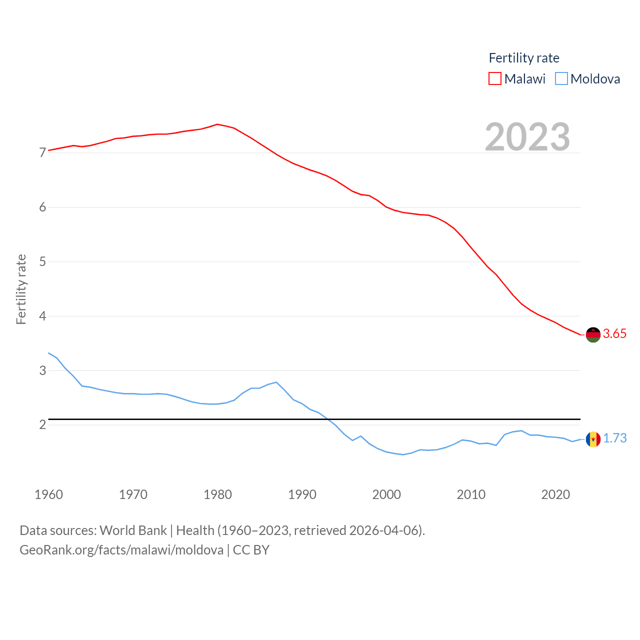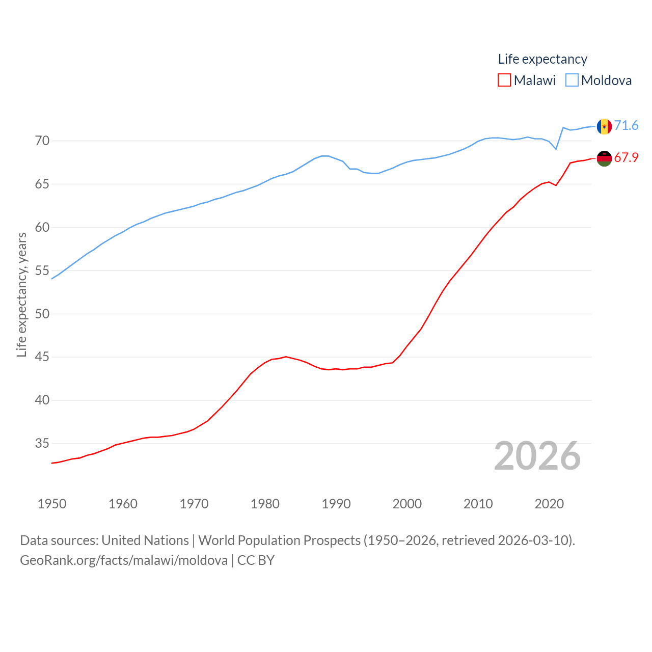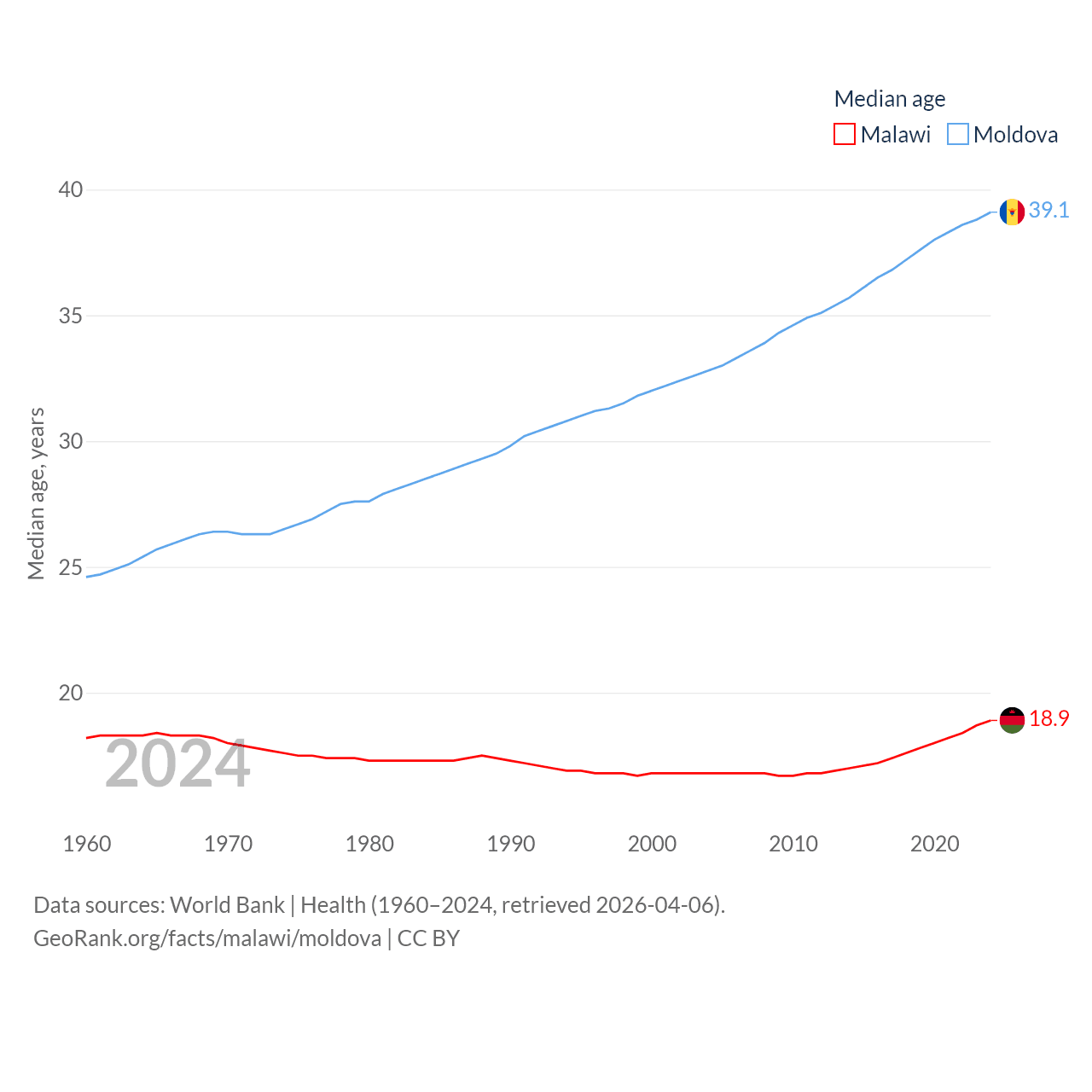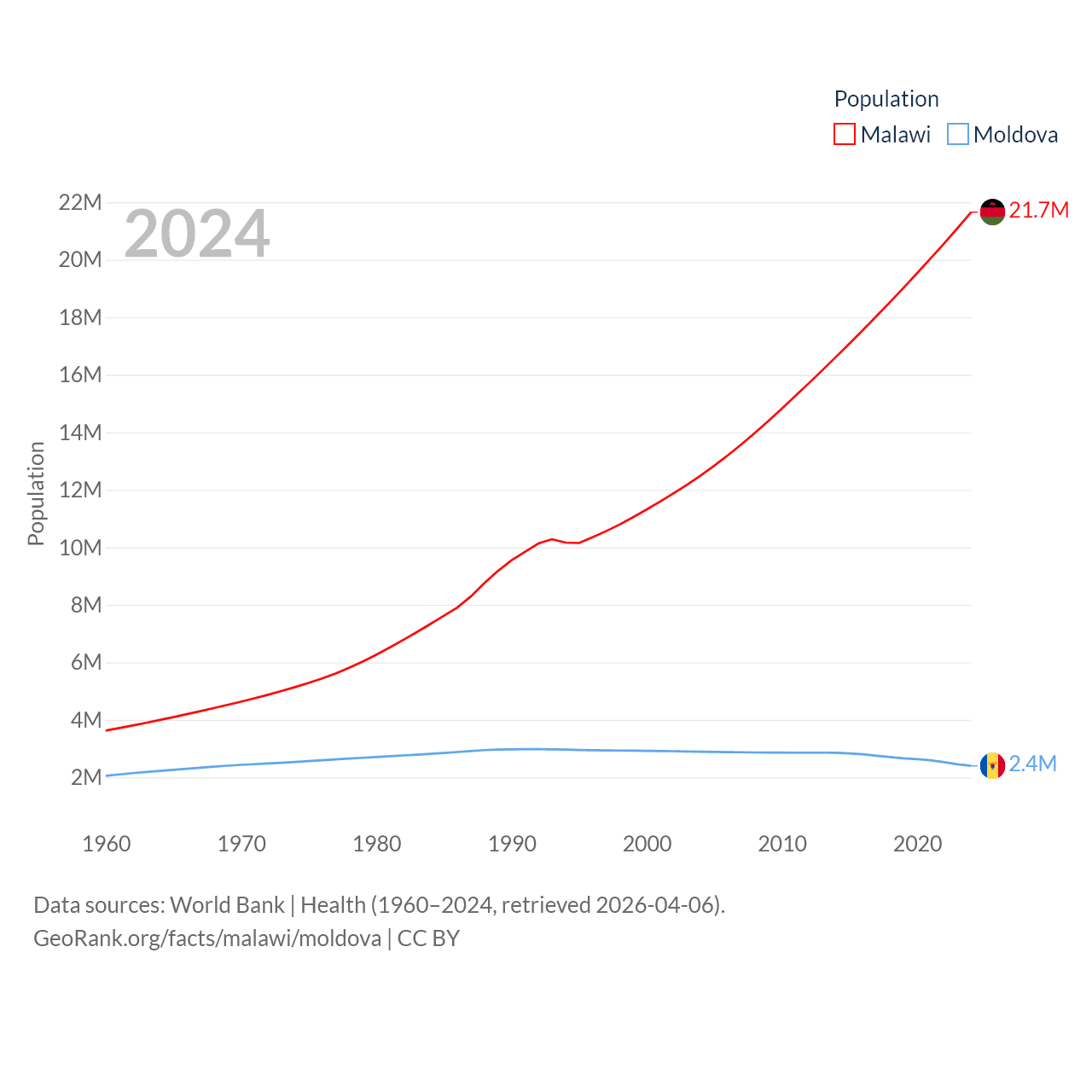 Malawi has a population of 21.7M (ranked 62/197), compared with 2.4M in Moldova (ranked 143/197). Malawi's land area is 36,402 sq mi versus 12,714 sq mi for Moldova (ranked 107th vs. 135th).