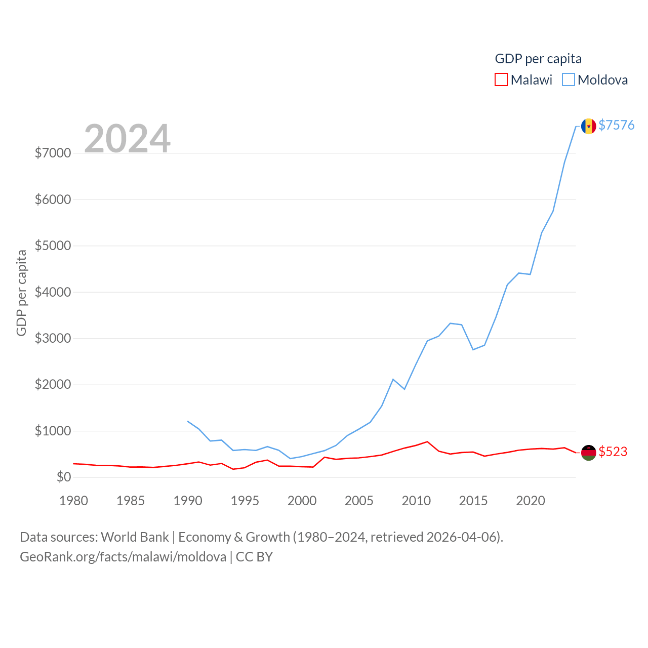 By GDP, Malawi ranks 151/197 ($11.3B) and Moldova ranks 134/197 ($18.2B). By GDP per capita, Malawi ranks 194/197 ($523), while Moldova ranks 99/197 ($7,576).