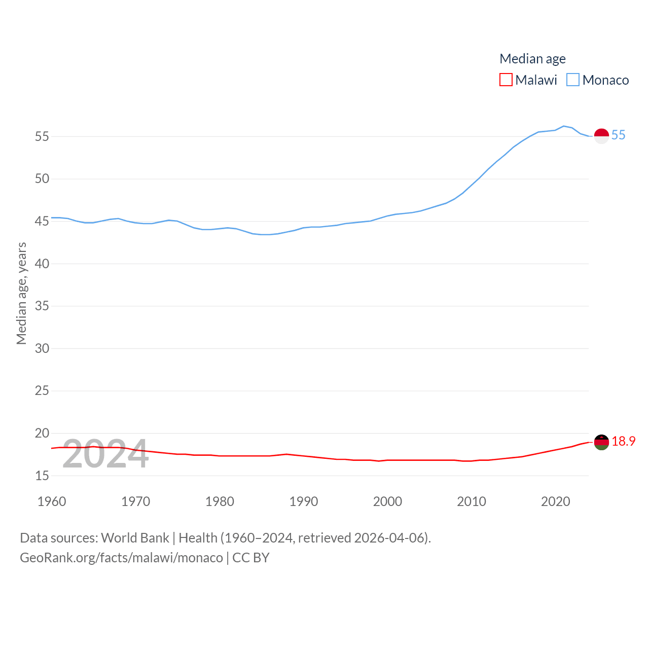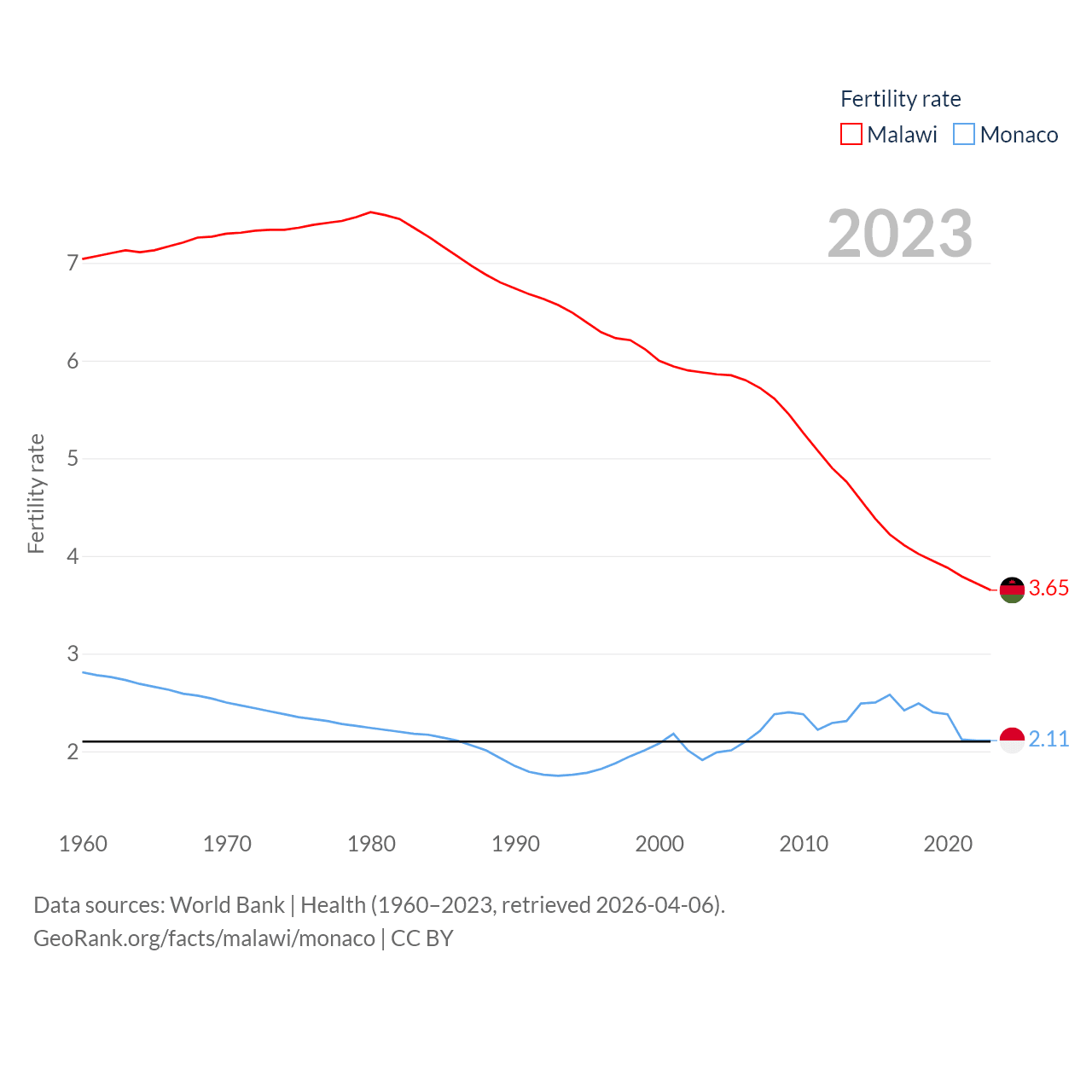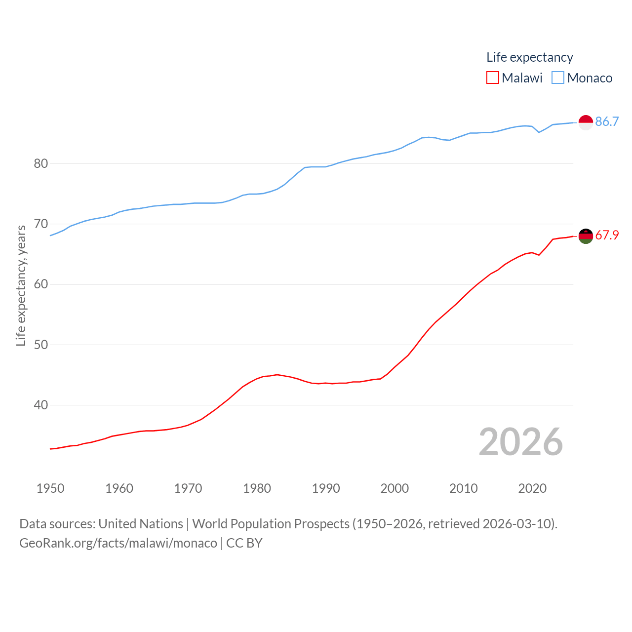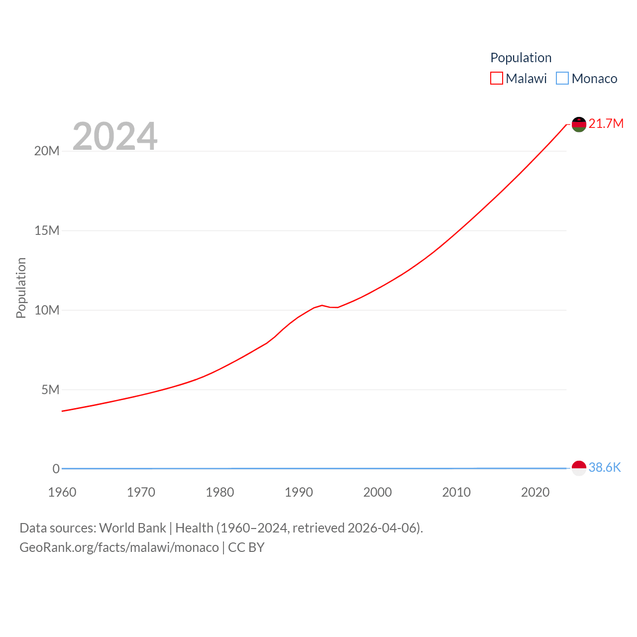 Malawi has a population of 21.7M (ranked 62/197), compared with 38.6K in Monaco (ranked 191/197). Malawi's land area is 36,402 sq mi versus 0.8 sq mi for Monaco (ranked 107th vs. 196th).