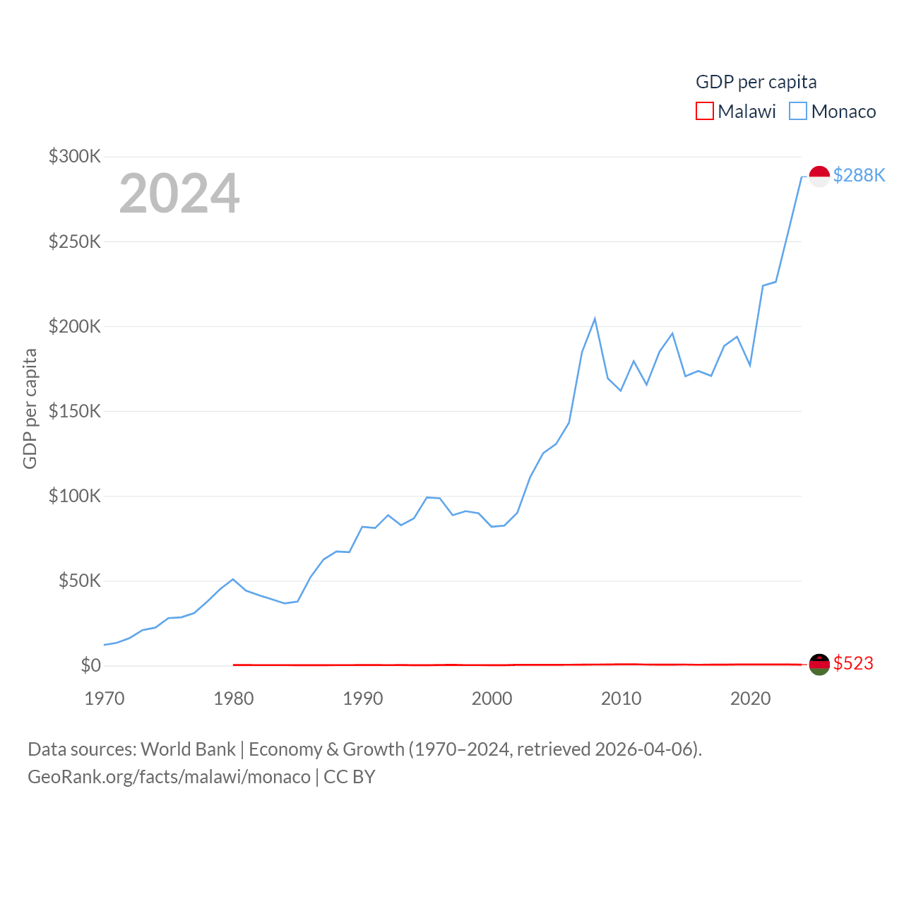 By GDP, Malawi ranks 151/197 ($11.3B) and Monaco ranks 152/197 ($11.1B). By GDP per capita, Malawi ranks 194/197 ($523), while Monaco ranks 1/197 ($288,001).