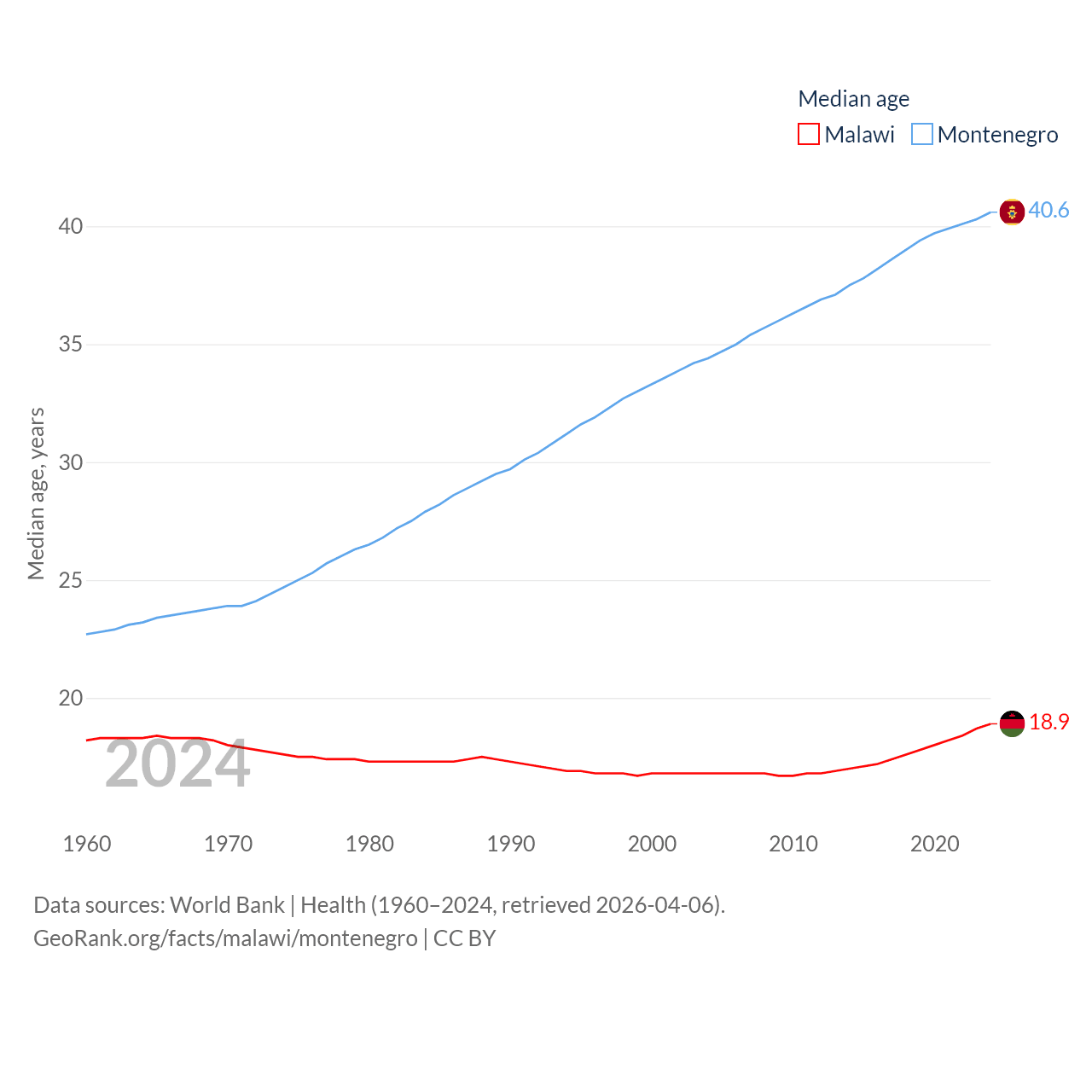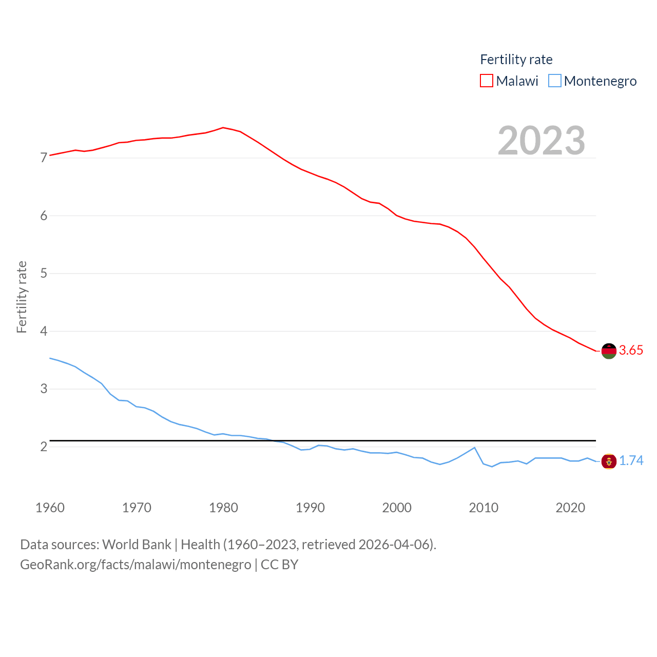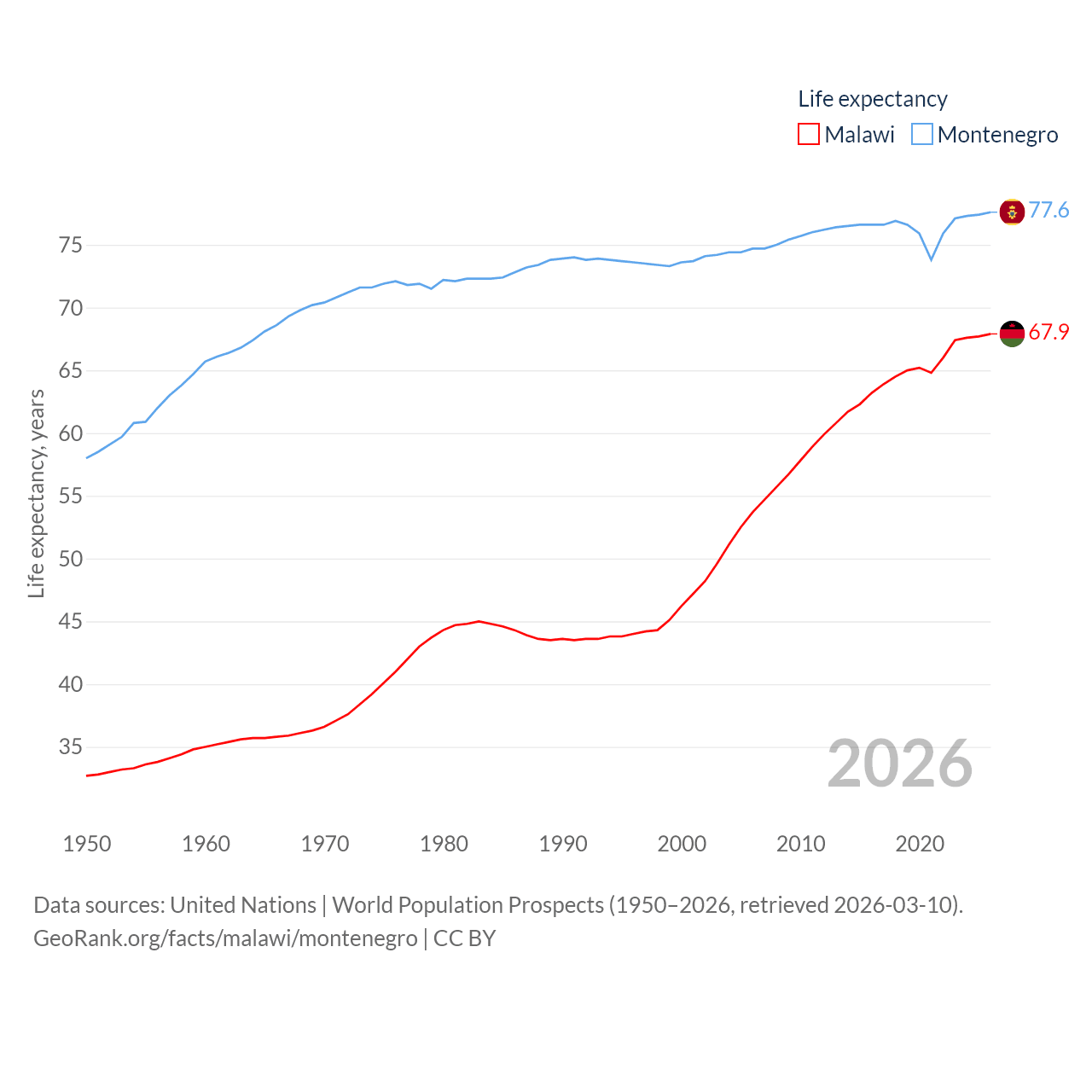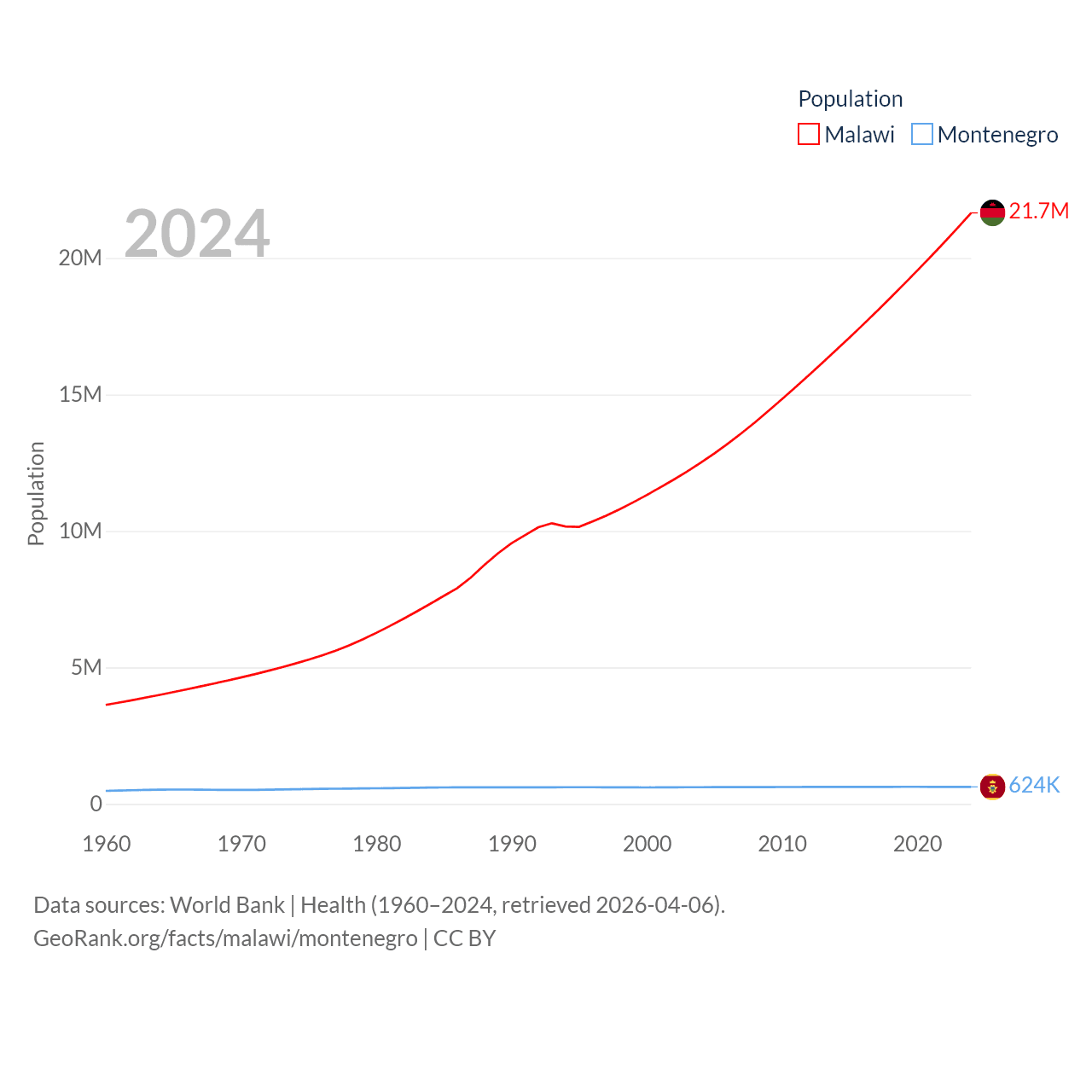 Malawi has a population of 21.7M (ranked 62/197), compared with 624K in Montenegro (ranked 166/197). Malawi's land area is 36,402 sq mi versus 5,193 sq mi for Montenegro (ranked 107th vs. 156th).