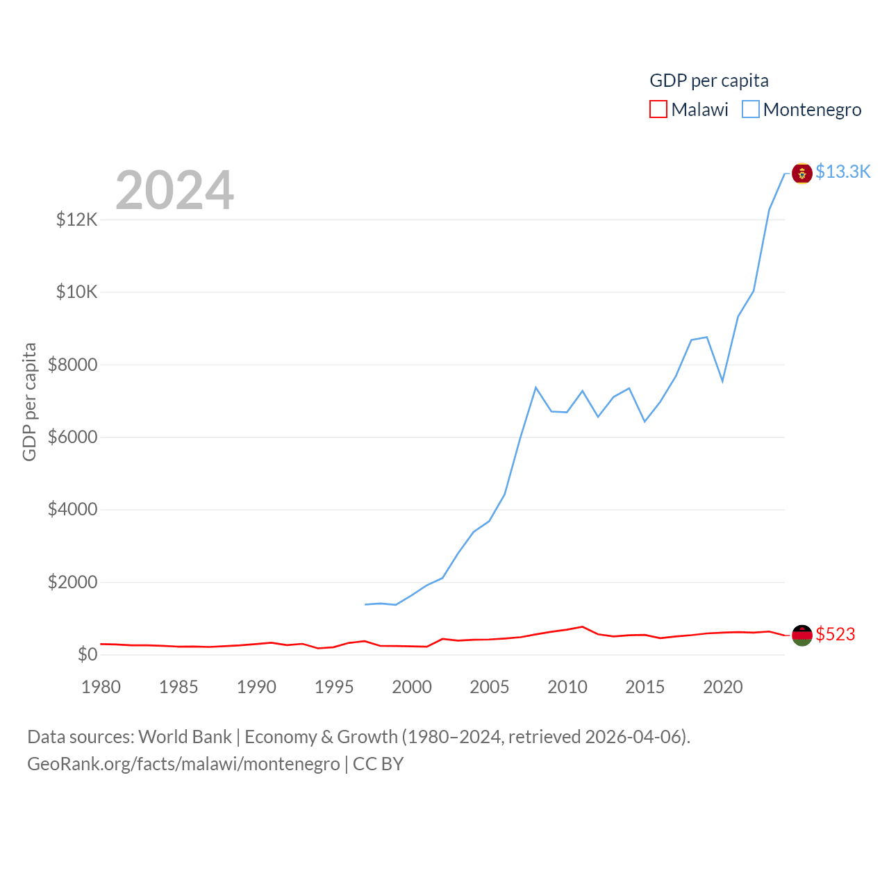 By GDP, Malawi ranks 151/197 ($11.3B) and Montenegro ranks 155/197 ($8.27B). By GDP per capita, Malawi ranks 194/197 ($523), while Montenegro ranks 77/197 ($13,263).