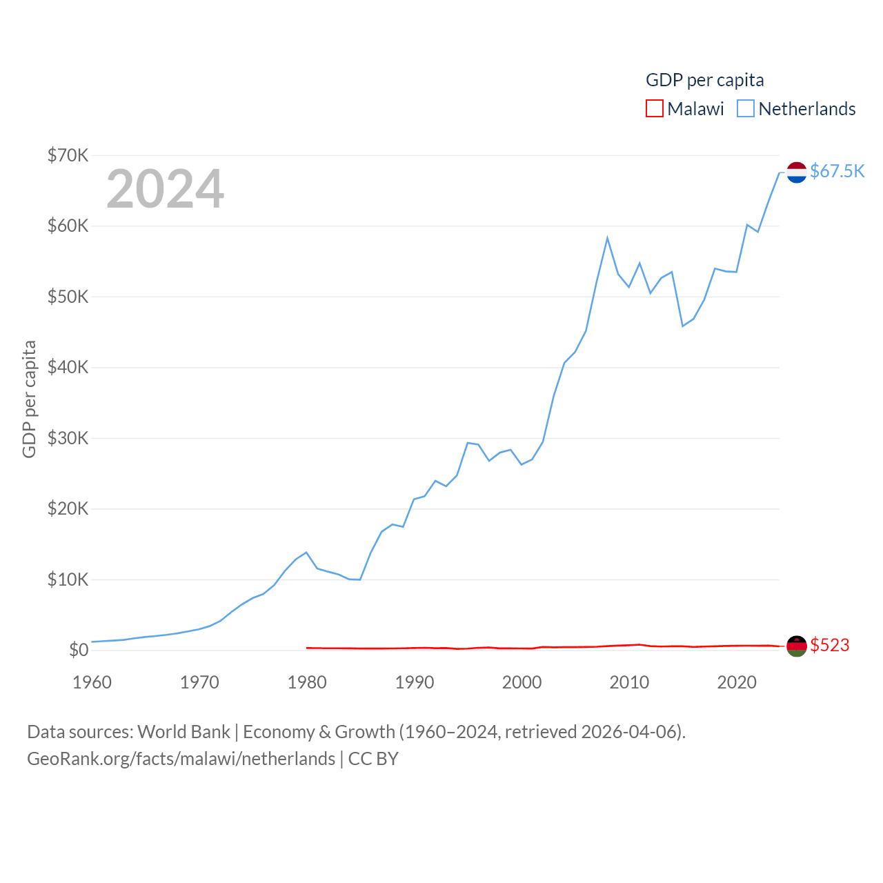 By GDP, Malawi ranks 151/197 ($11.3B) and The Netherlands ranks 19/197 ($1.21T). By GDP per capita, Malawi ranks 194/197 ($523), while The Netherlands ranks 13/197 ($67,520).