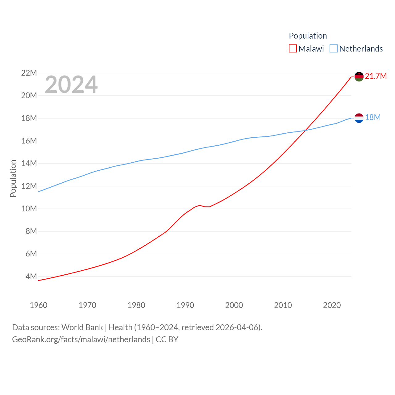 Malawi has a population of 21.7M (ranked 62/197), compared with 18M in The Netherlands (ranked 72/197). Malawi's land area is 36,402 sq mi versus 13,000 sq mi for The Netherlands (ranked 107th vs. 134th).