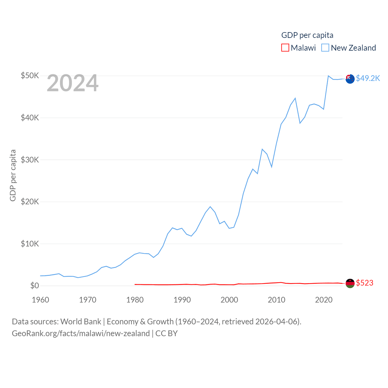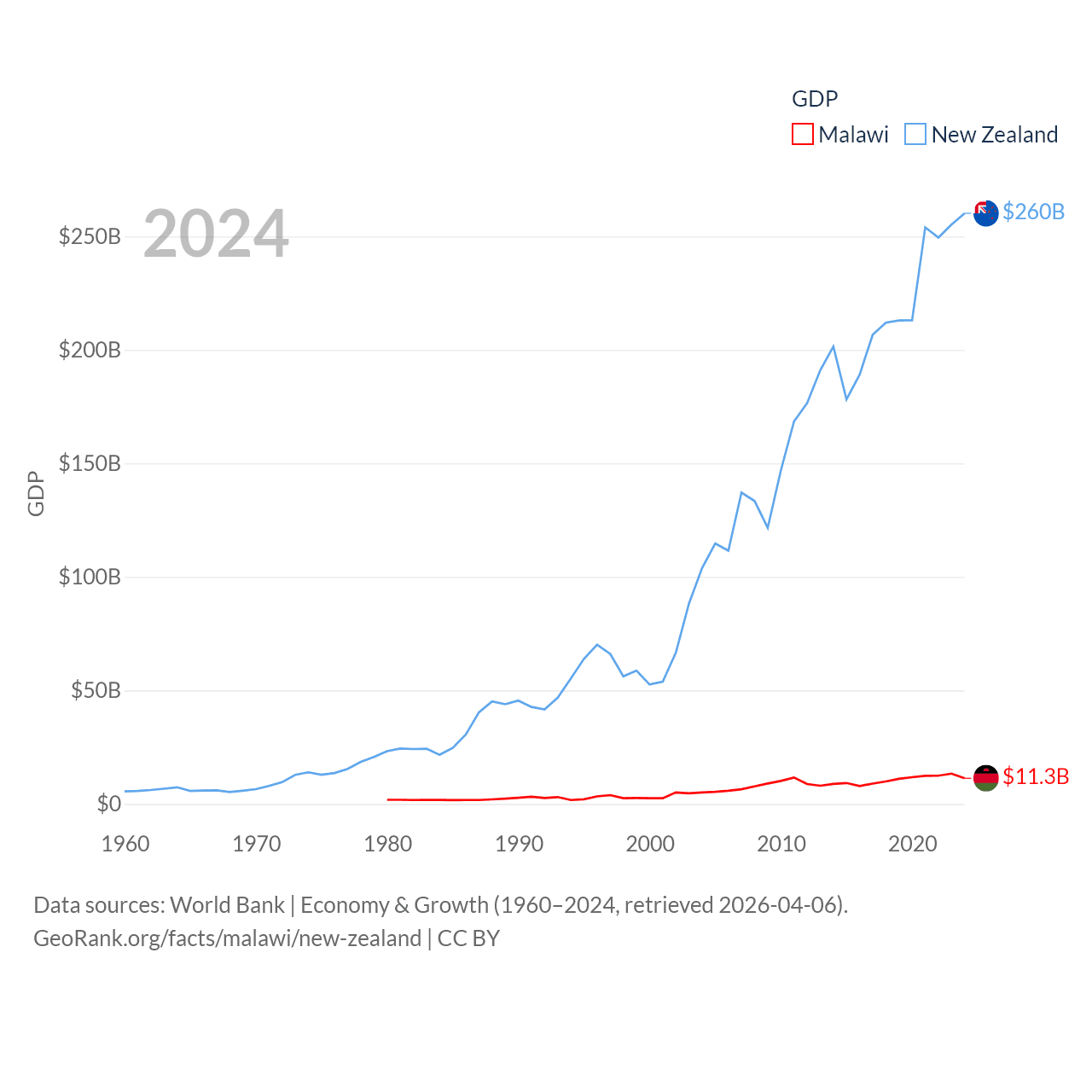 By GDP, Malawi ranks 151/197 ($11.3B) and New Zealand ranks 52/197 ($260B). By GDP per capita, Malawi ranks 194/197 ($523), while New Zealand ranks 26/197 ($49,205).