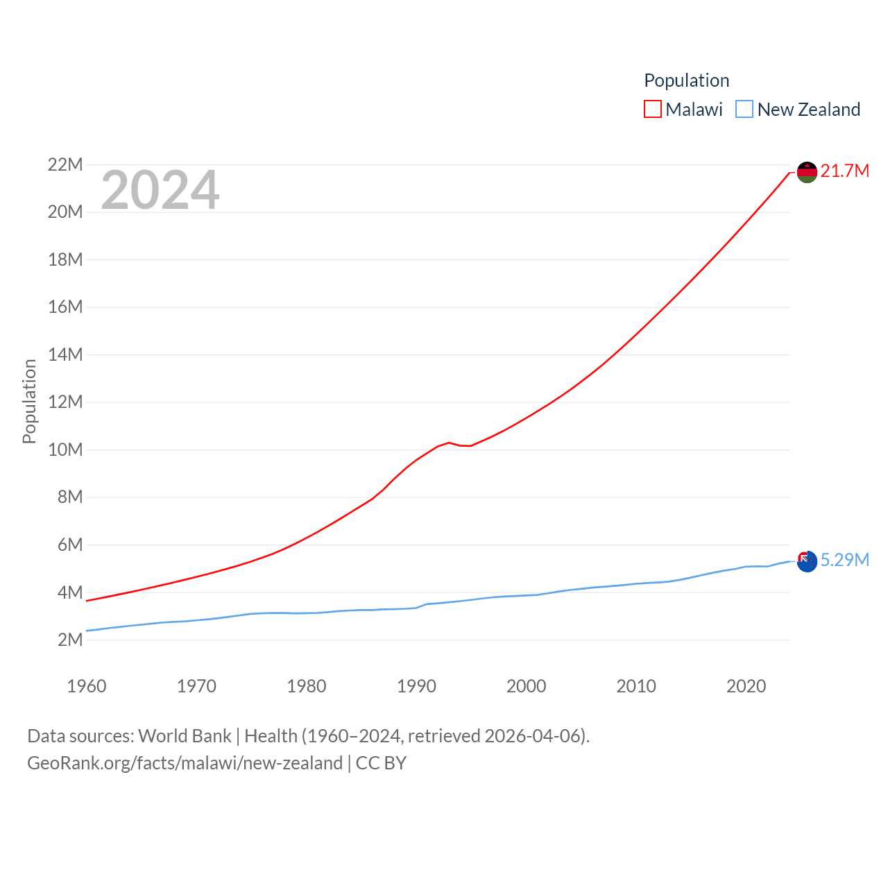 Malawi has a population of 21.7M (ranked 62/197), compared with 5.29M in New Zealand (ranked 123/197). Malawi's land area is 36,402 sq mi versus 101,665 sq mi for New Zealand (ranked 107th vs. 74th).
