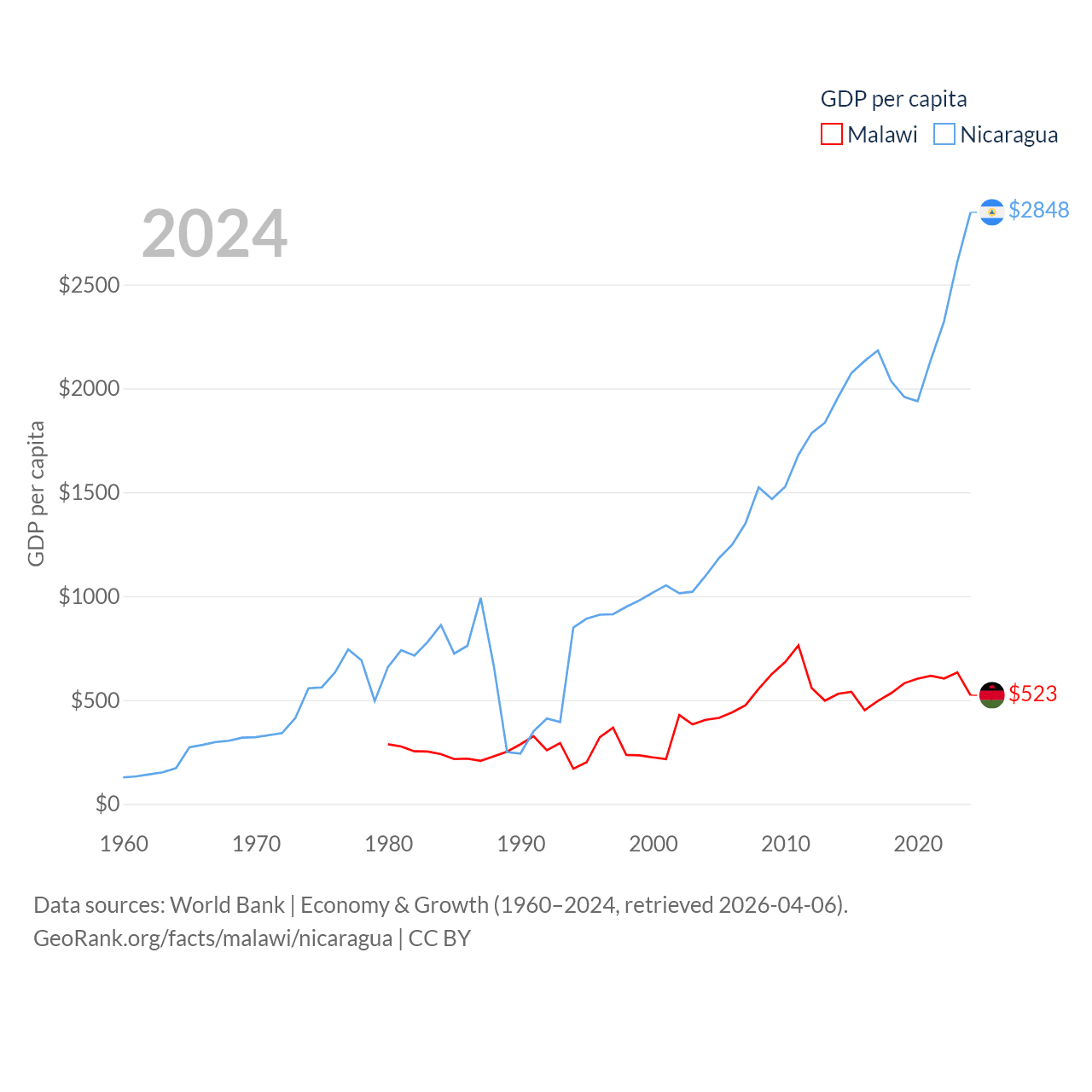 By GDP, Malawi ranks 151/197 ($11.3B) and Nicaragua ranks 131/197 ($19.7B). By GDP per capita, Malawi ranks 194/197 ($523), while Nicaragua ranks 141/197 ($2,848).