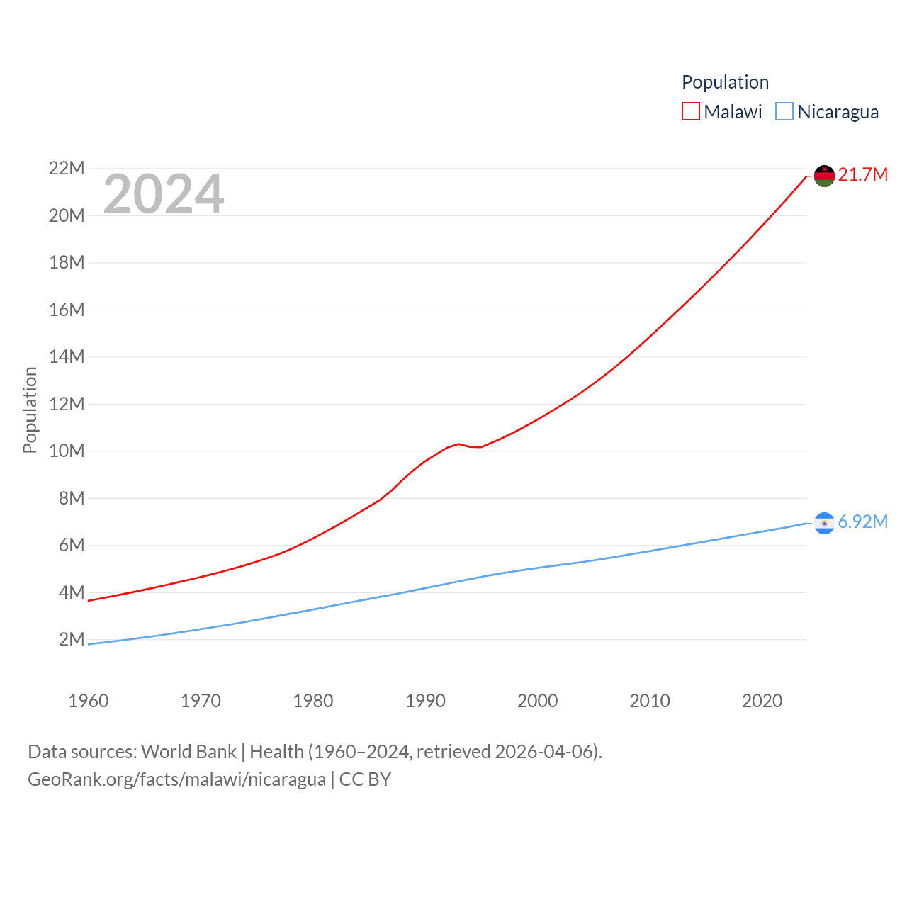 Malawi has a population of 21.7M (ranked 62/197), compared with 6.92M in Nicaragua (ranked 108/197). Malawi's land area is 36,402 sq mi versus 46,464 sq mi for Nicaragua (ranked 107th vs. 98th).