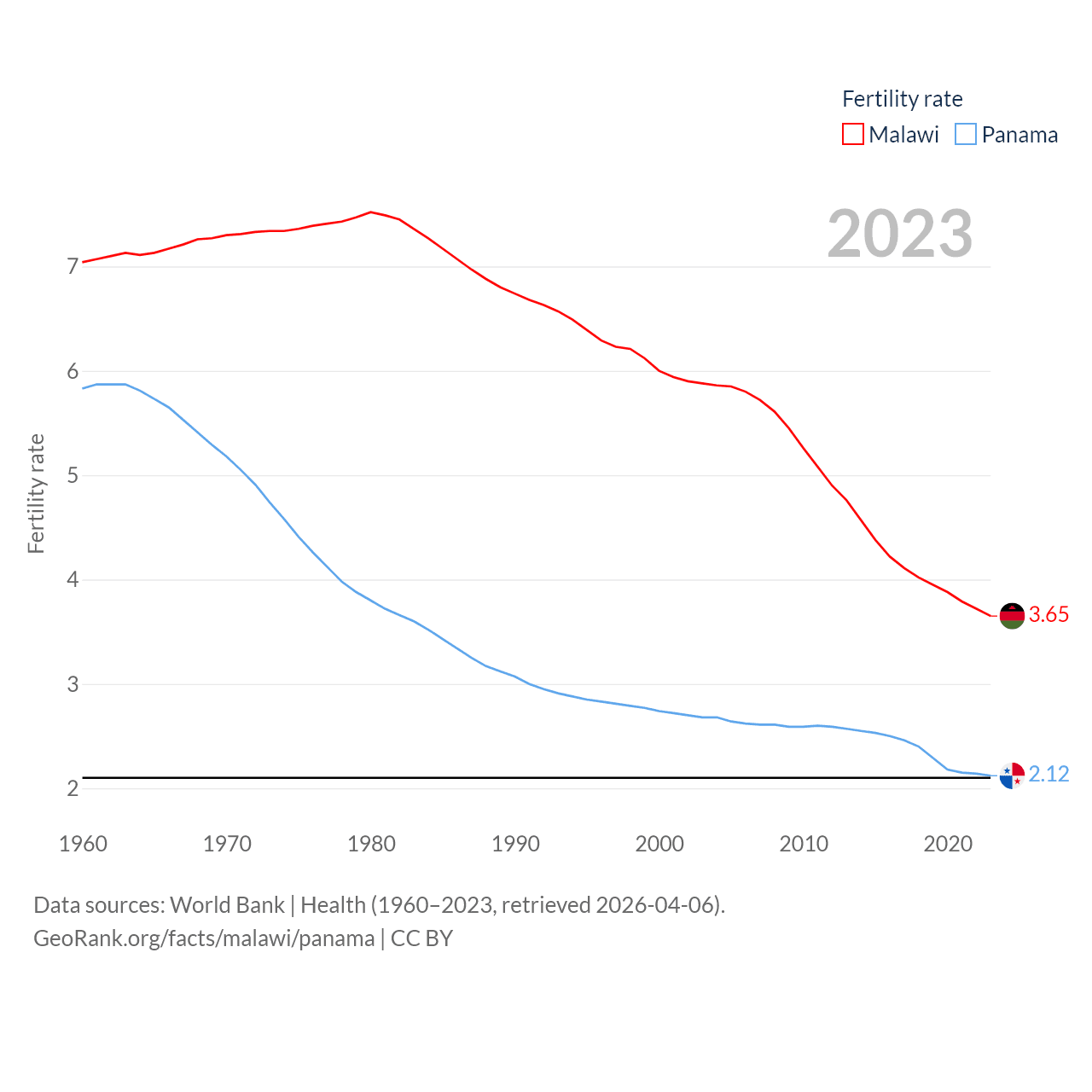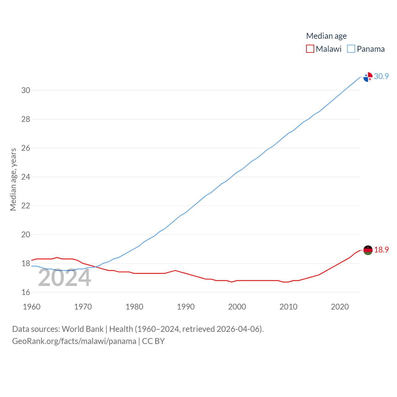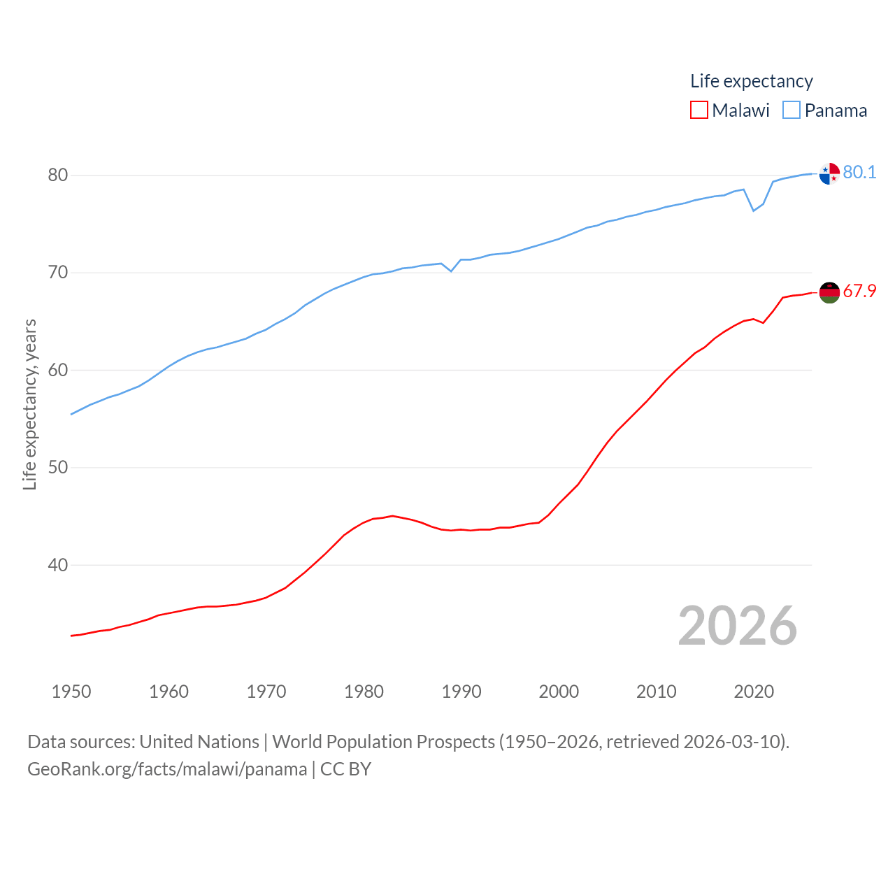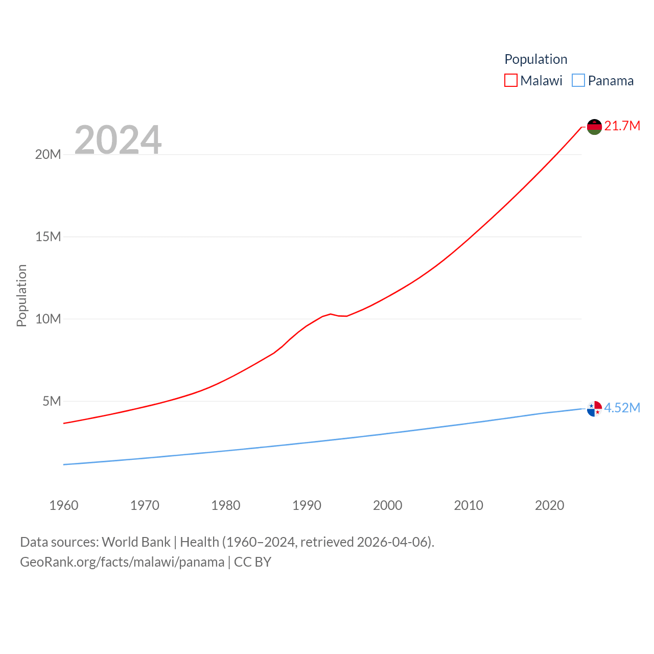 Malawi has a population of 21.7M (ranked 62/197), compared with 4.52M in Panama (ranked 128/197). Malawi's land area is 36,402 sq mi versus 28,641 sq mi for Panama (ranked 107th vs. 115th).