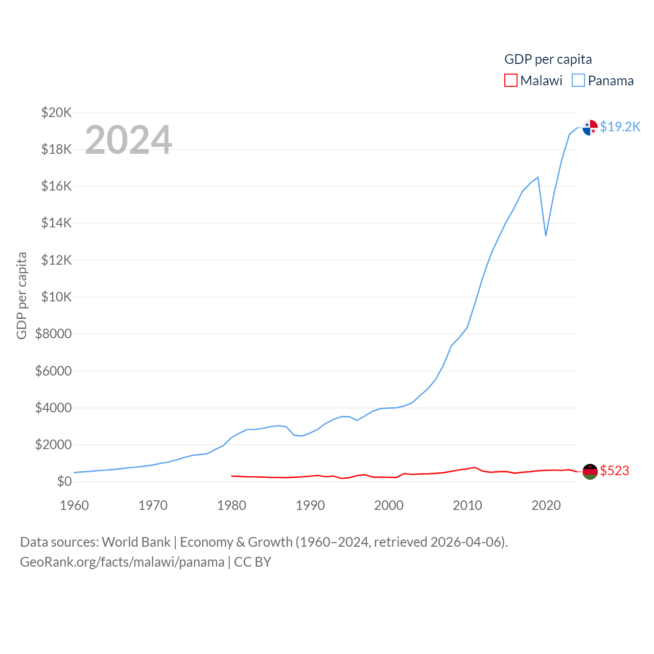 By GDP, Malawi ranks 151/197 ($11.3B) and Panama ranks 78/197 ($86.5B). By GDP per capita, Malawi ranks 194/197 ($523), while Panama ranks 60/197 ($19,161).