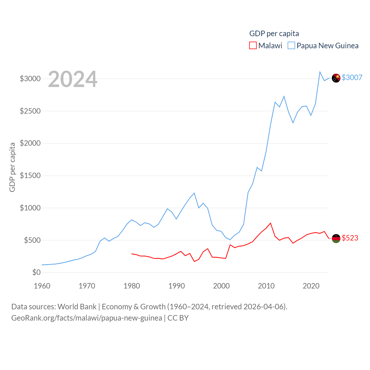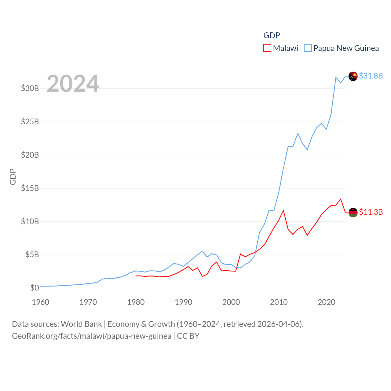 By GDP, Malawi ranks 151/197 ($11.3B) and Papua New Guinea ranks 110/197 ($31.8B). By GDP per capita, Malawi ranks 194/197 ($523), while Papua New Guinea ranks 140/197 ($3,007).