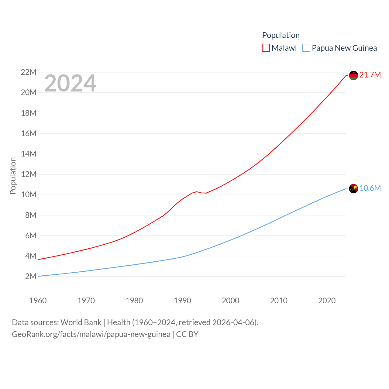 Malawi has a population of 21.7M (ranked 62/197), compared with 10.6M in Papua New Guinea (ranked 92/197). Malawi's land area is 36,402 sq mi versus 174,850 sq mi for Papua New Guinea (ranked 107th vs. 54th).