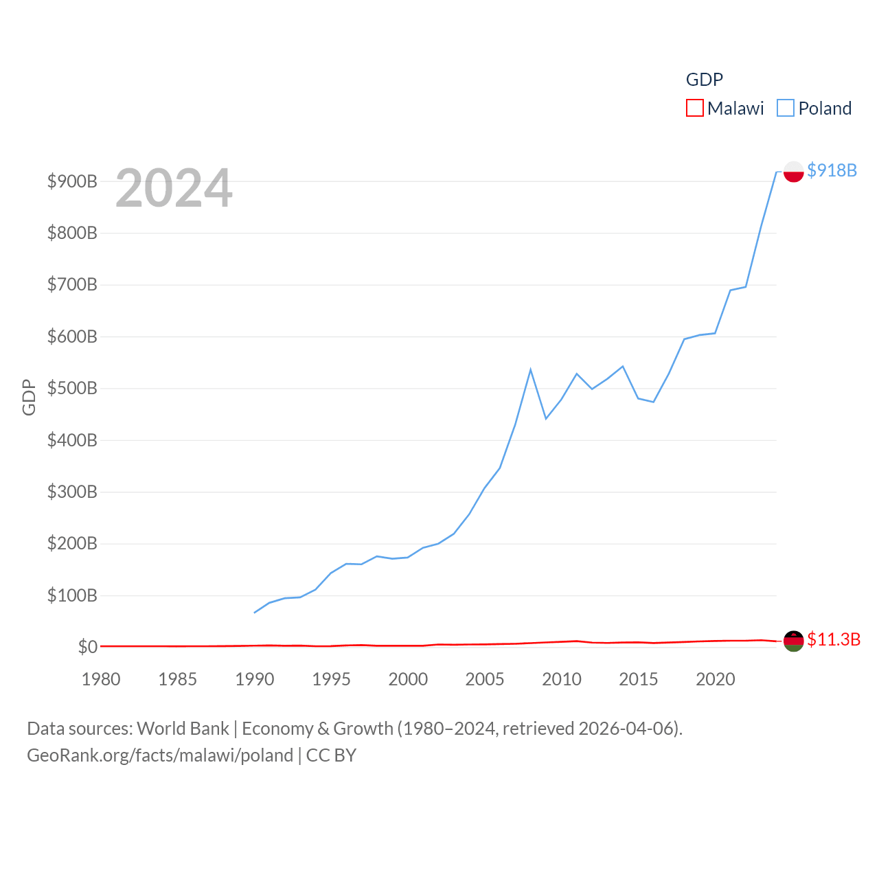 By GDP, Malawi ranks 151/197 ($11.3B) and Poland ranks 21/197 ($918B). By GDP per capita, Malawi ranks 194/197 ($523), while Poland ranks 48/197 ($25,104).