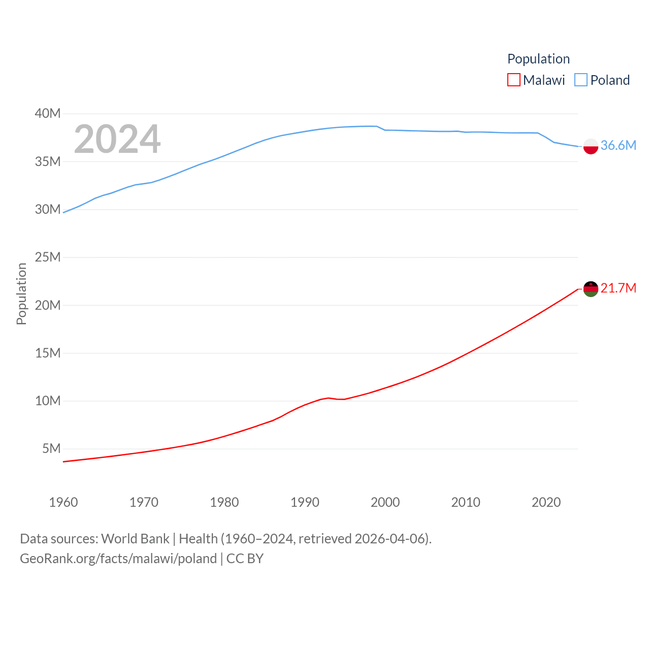 Malawi has a population of 21.7M (ranked 62/197), compared with 36.6M in Poland (ranked 42/197). Malawi's land area is 36,402 sq mi versus 118,252 sq mi for Poland (ranked 107th vs. 69th).