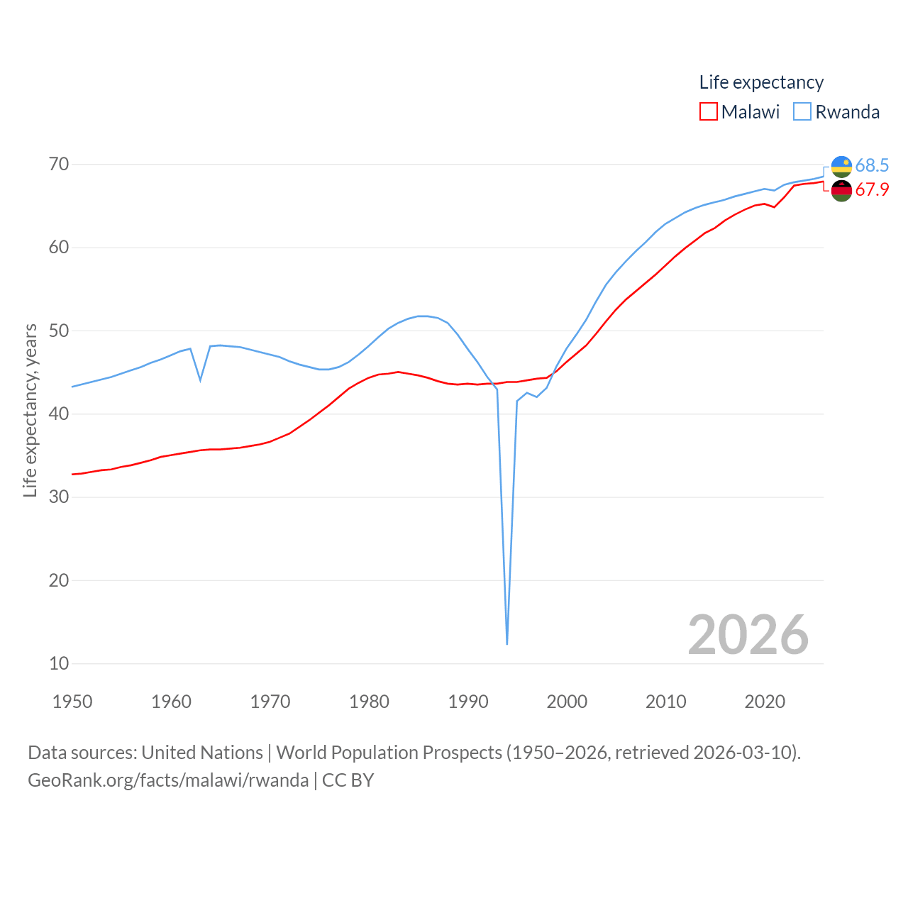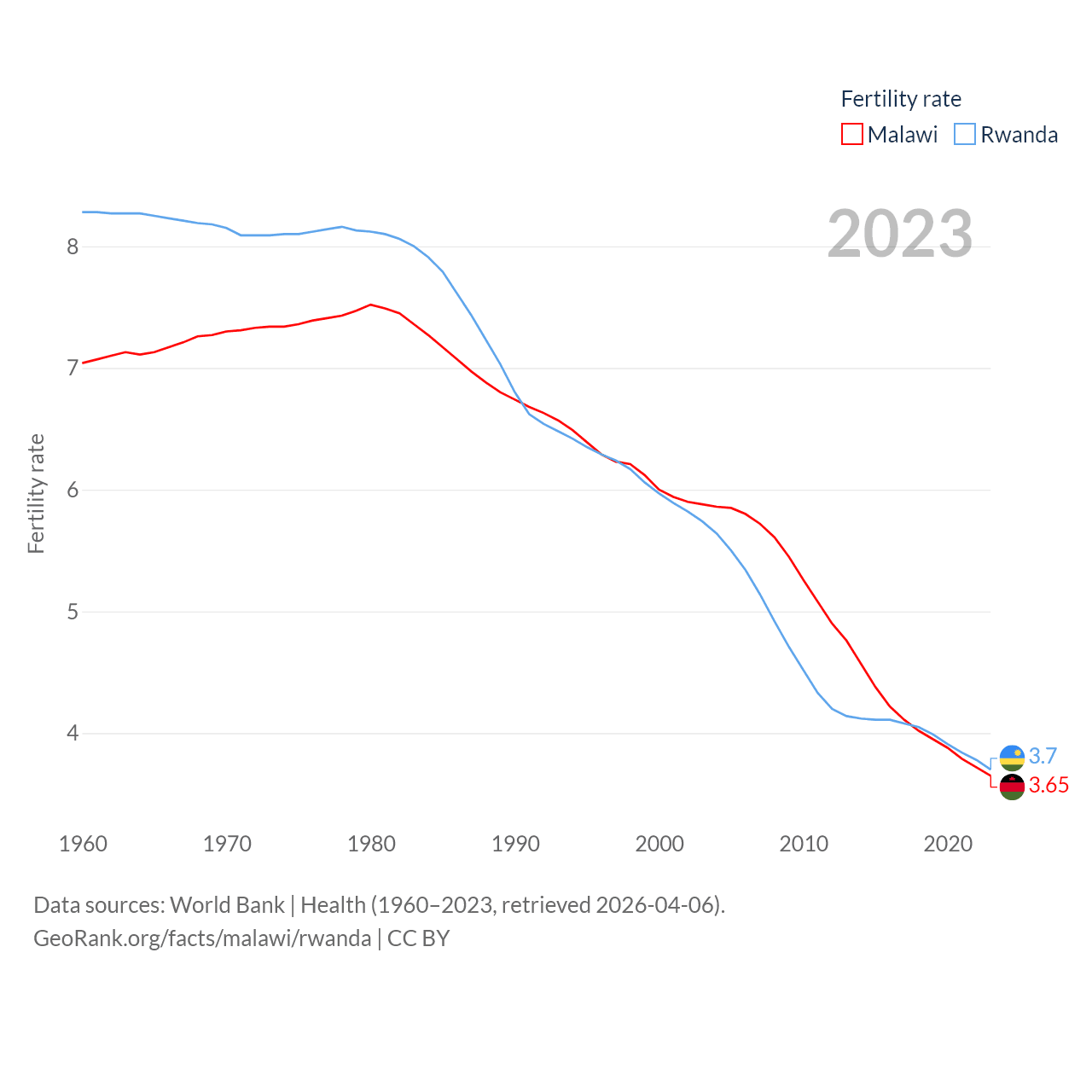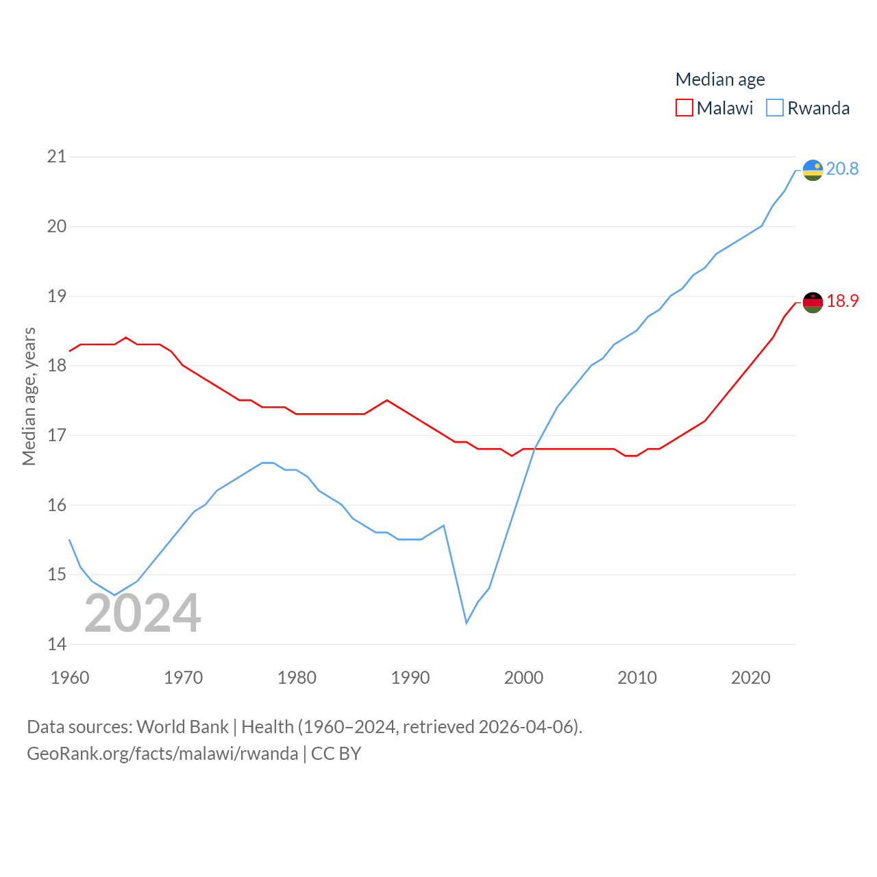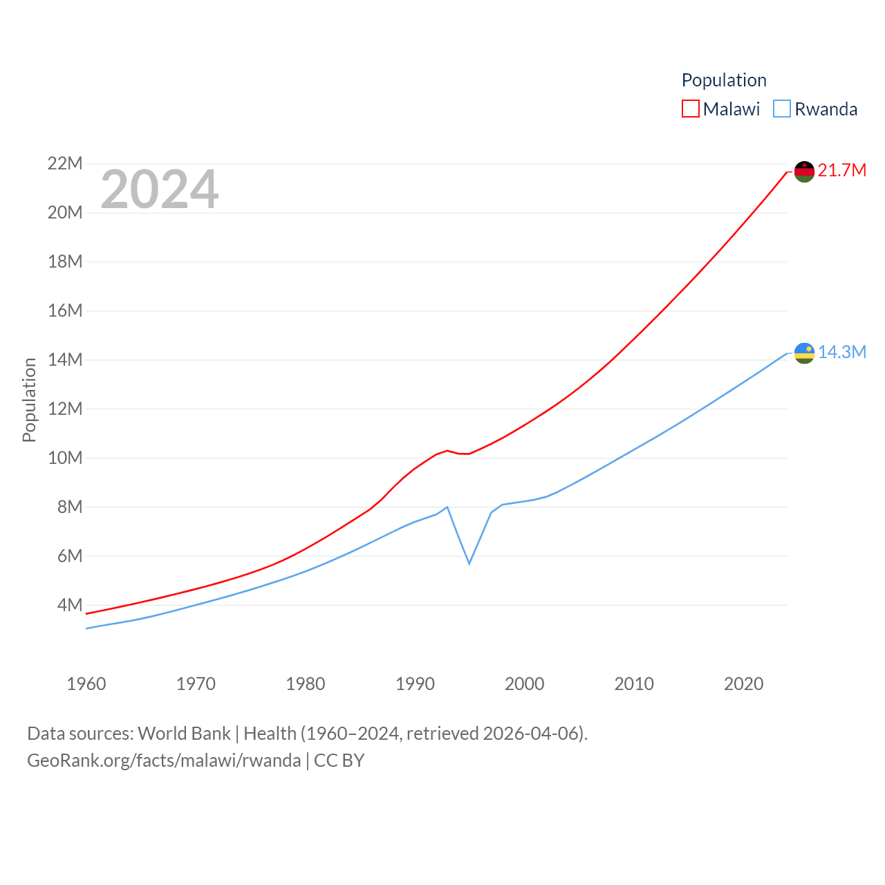 Malawi has a population of 21.7M (ranked 62/197), compared with 14.3M in Rwanda (ranked 77/197). Malawi's land area is 36,402 sq mi versus 9,525 sq mi for Rwanda (ranked 107th vs. 146th).
