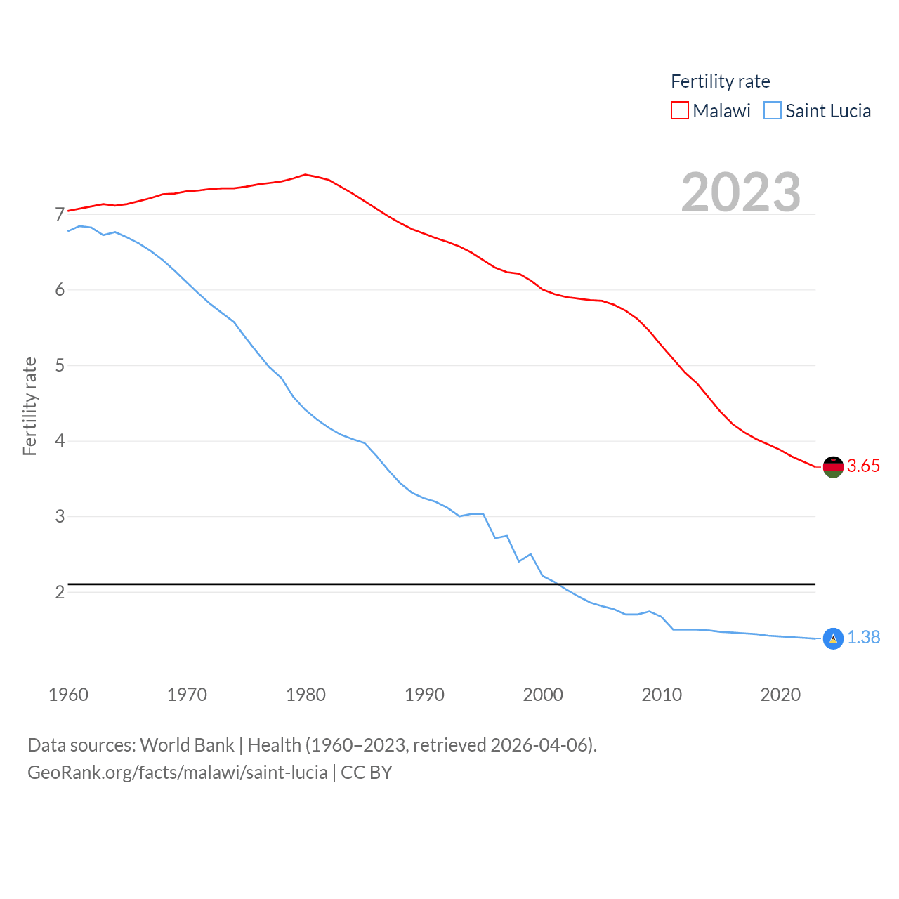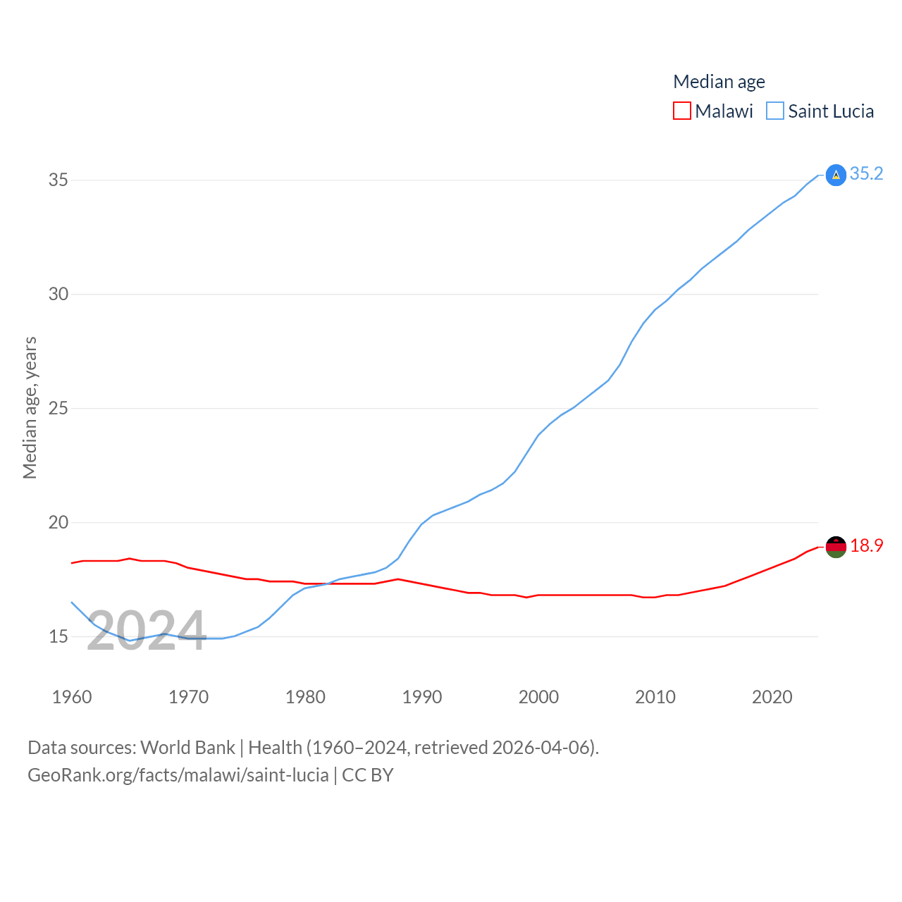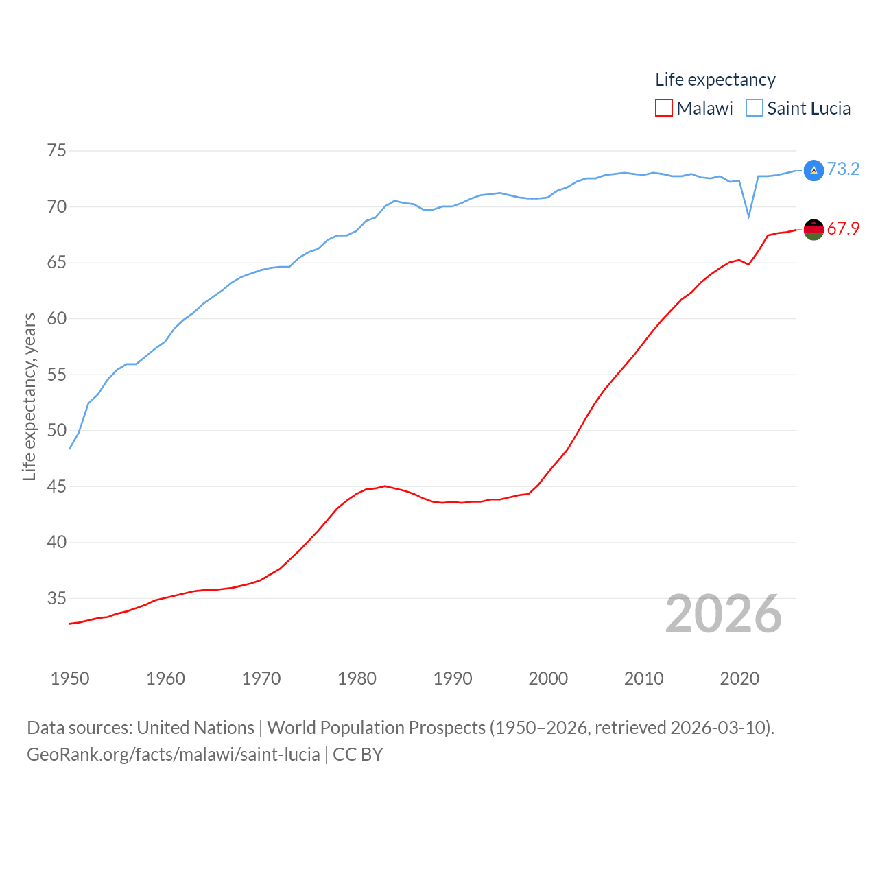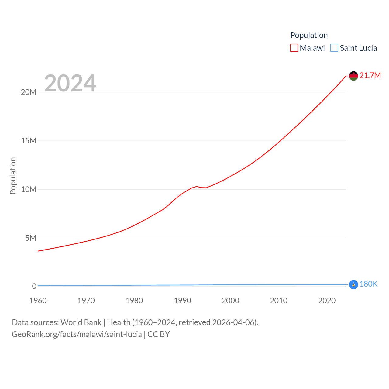 Malawi has a population of 21.7M (ranked 62/197), compared with 180K in Saint Lucia (ranked 178/197). Malawi's land area is 36,402 sq mi versus 235.5 sq mi for Saint Lucia (ranked 107th vs. 178th).