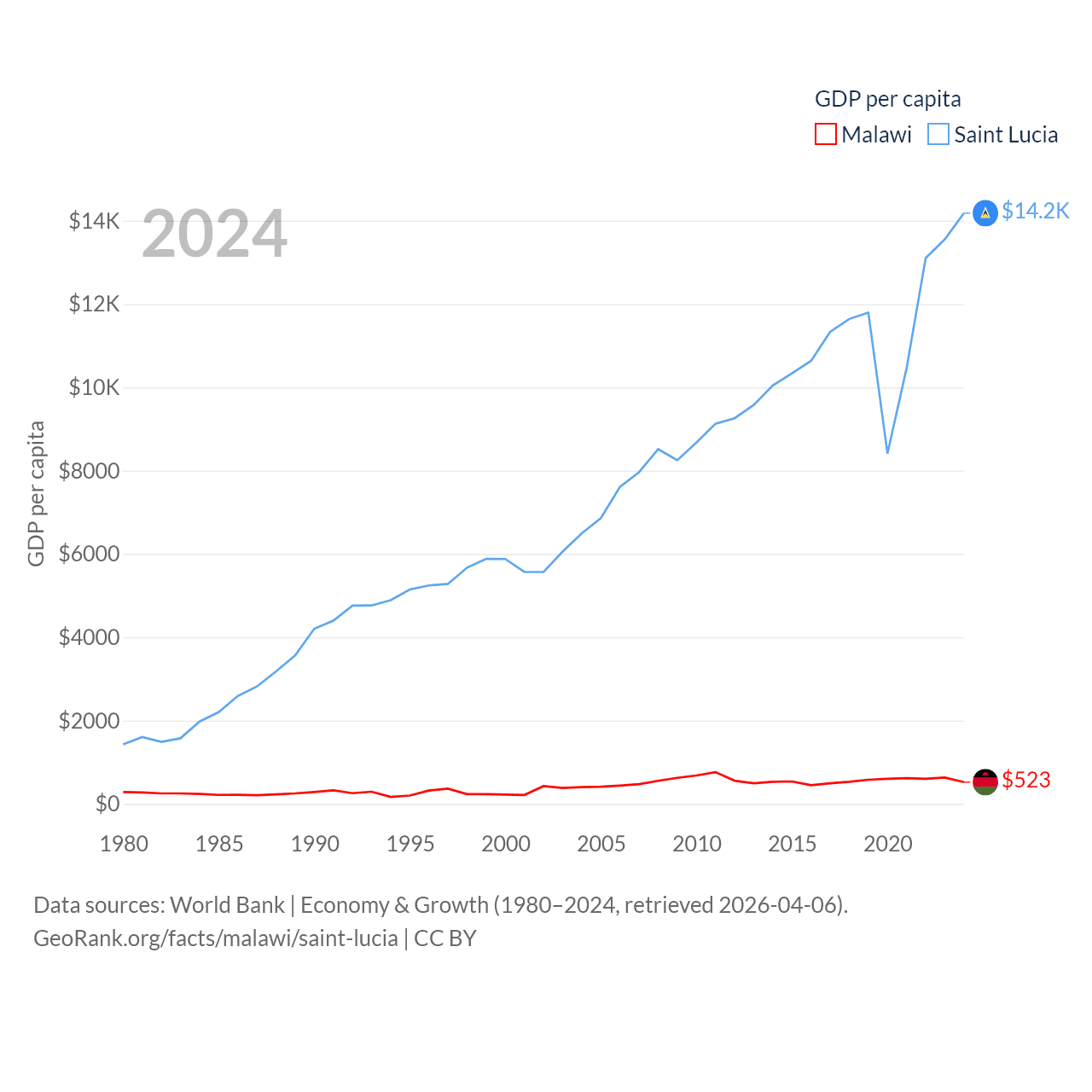 By GDP, Malawi ranks 151/197 ($11.3B) and Saint Lucia ranks 173/197 ($2.55B). By GDP per capita, Malawi ranks 194/197 ($523), while Saint Lucia ranks 70/197 ($14,182).