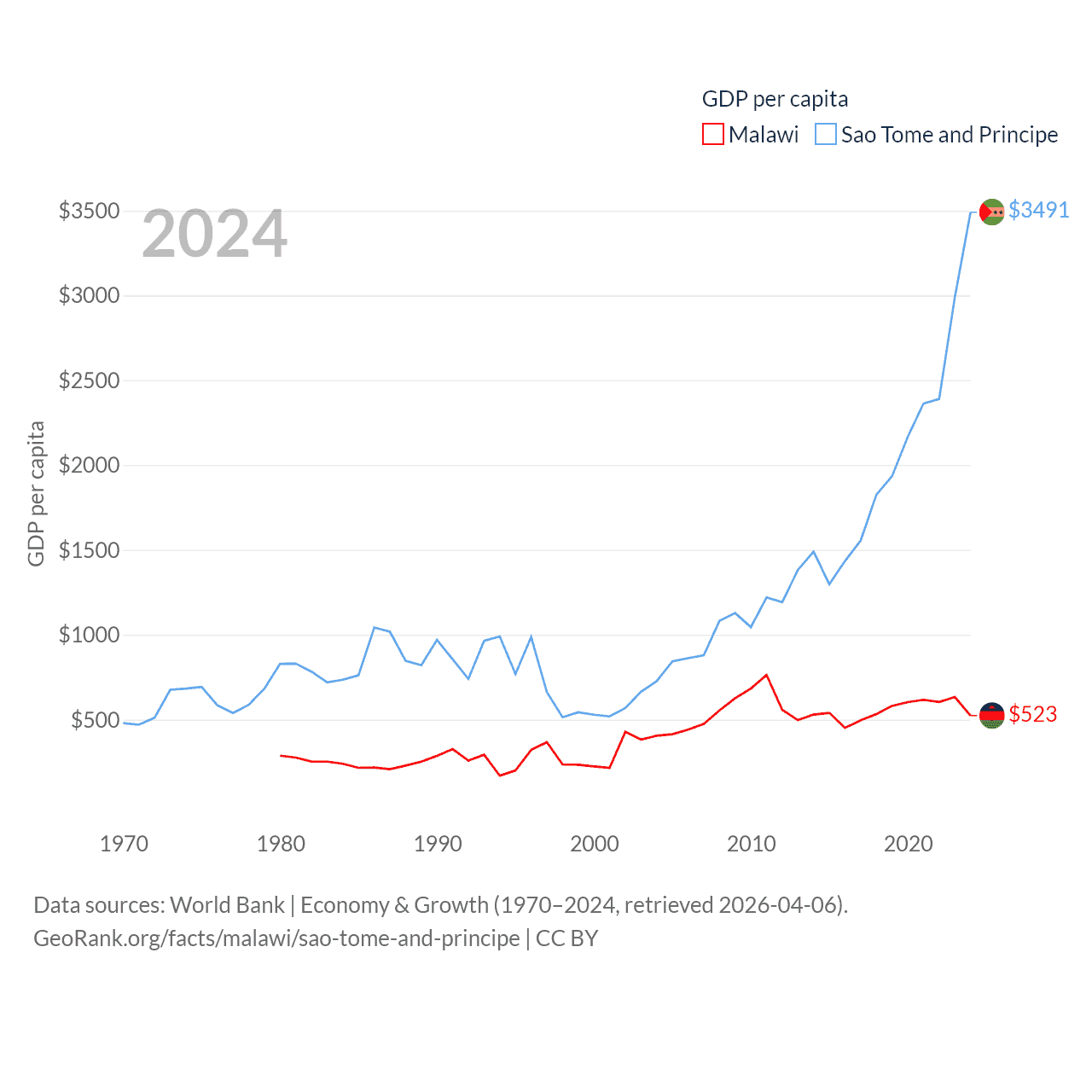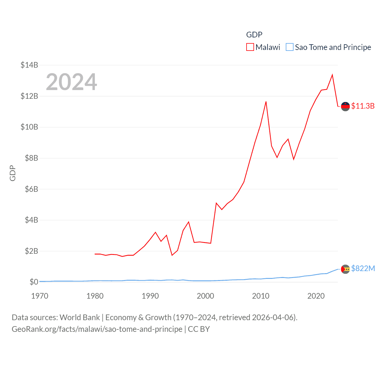 By GDP, Malawi ranks 151/197 ($11.3B) and Sao Tome and Principe ranks 189/197 ($822M). By GDP per capita, Malawi ranks 194/197 ($523), while Sao Tome and Principe ranks 134/197 ($3,491).